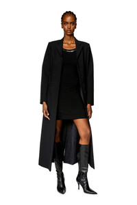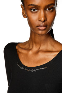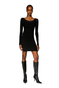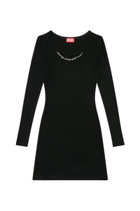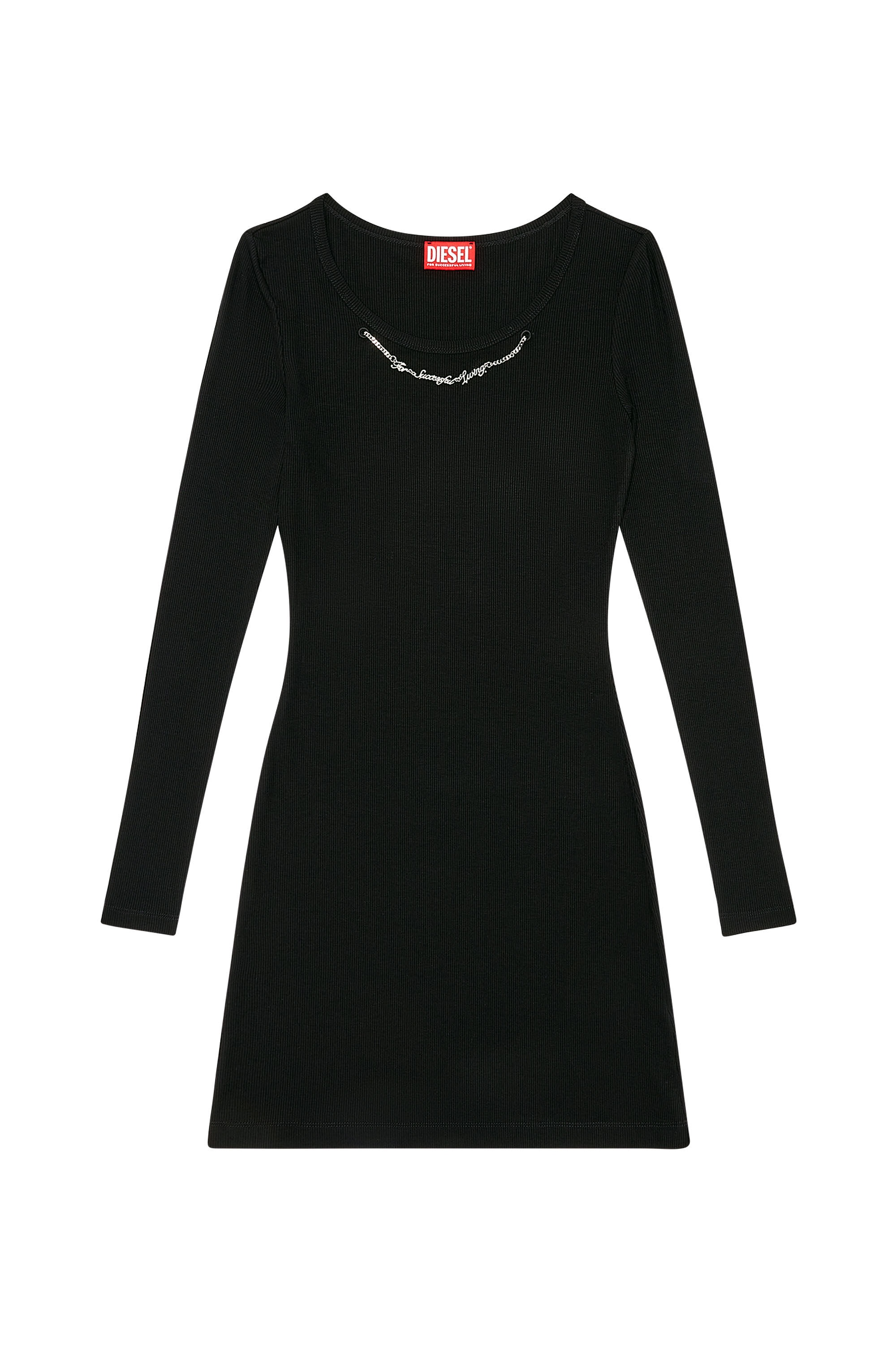 Model is wearing a size S and is 175 cm / 5'7'' Fits true to size, take your normal size. Women's short black dress with a body-hugging fit. Cut from flexible ribbed jersey made using ECOVERO™ viscose blended with stretch, this style has long sleeves and a scoop neckline embellished with a chain – note the plaques spelling out the iconic ‘For Successful Living’ slogan.