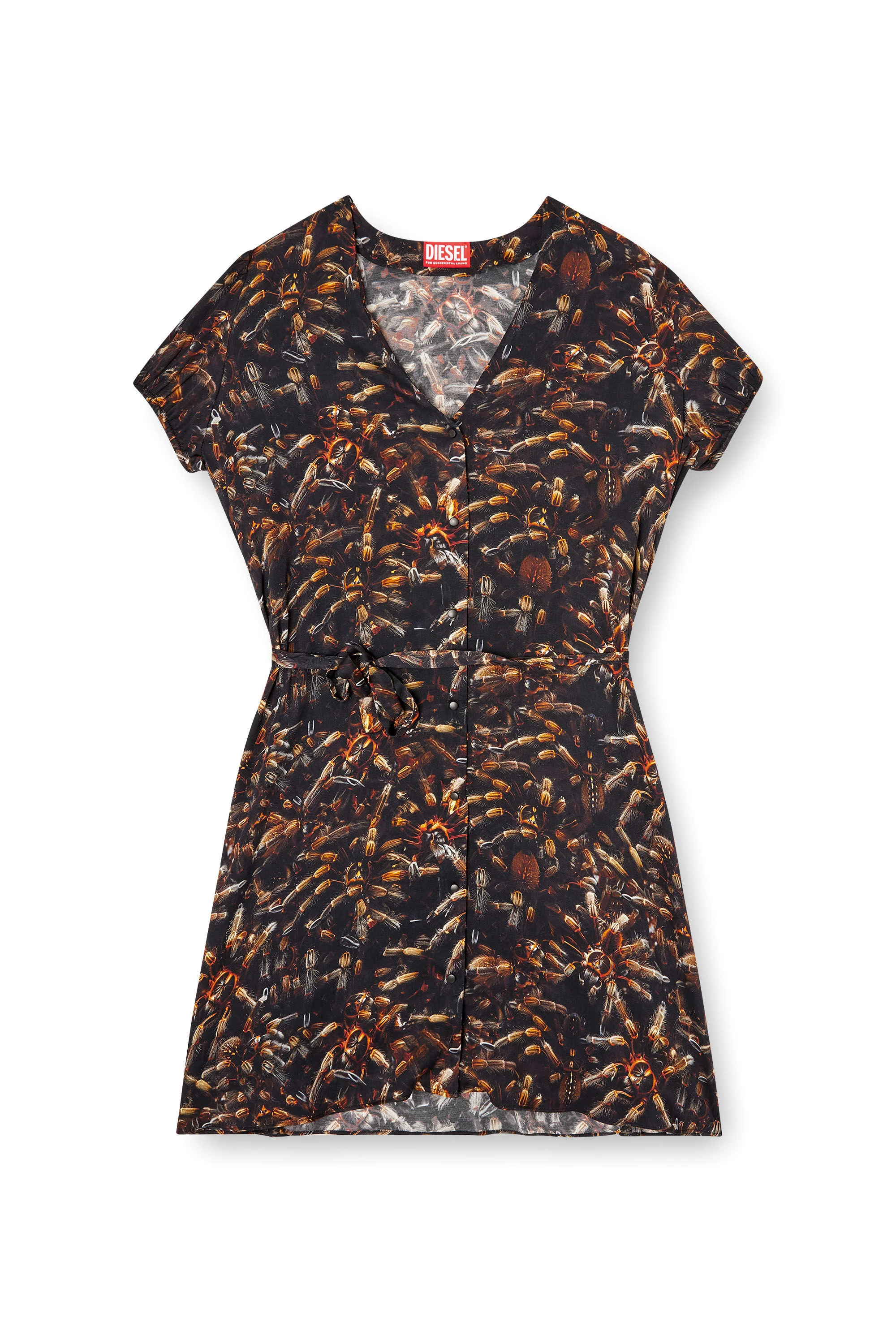 Product Description Viscose mini dress with regular fit, featuring a V-neck and short sleeves. It has a waist belt that accentuates the silhouette and an all-over print with a tarantula theme. The front opening has convenient metallic snap buttons, while the sleeves finish with a gathered hem thanks to elastic bands. The Oval D logo hangs at the back adding an extra touch of uniqueness. ID: A195970WFCL Size & Fit Model is wearing an IT size 40 and is 175 cm / 5'7'' Check the size chart to choose the correct size. Materials & Details Composition: 100%Viscose-Rayon Regular Fit V-neck Waistband Metal snap buttons Sleeves with elastic gathered cuffs