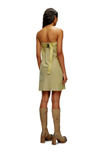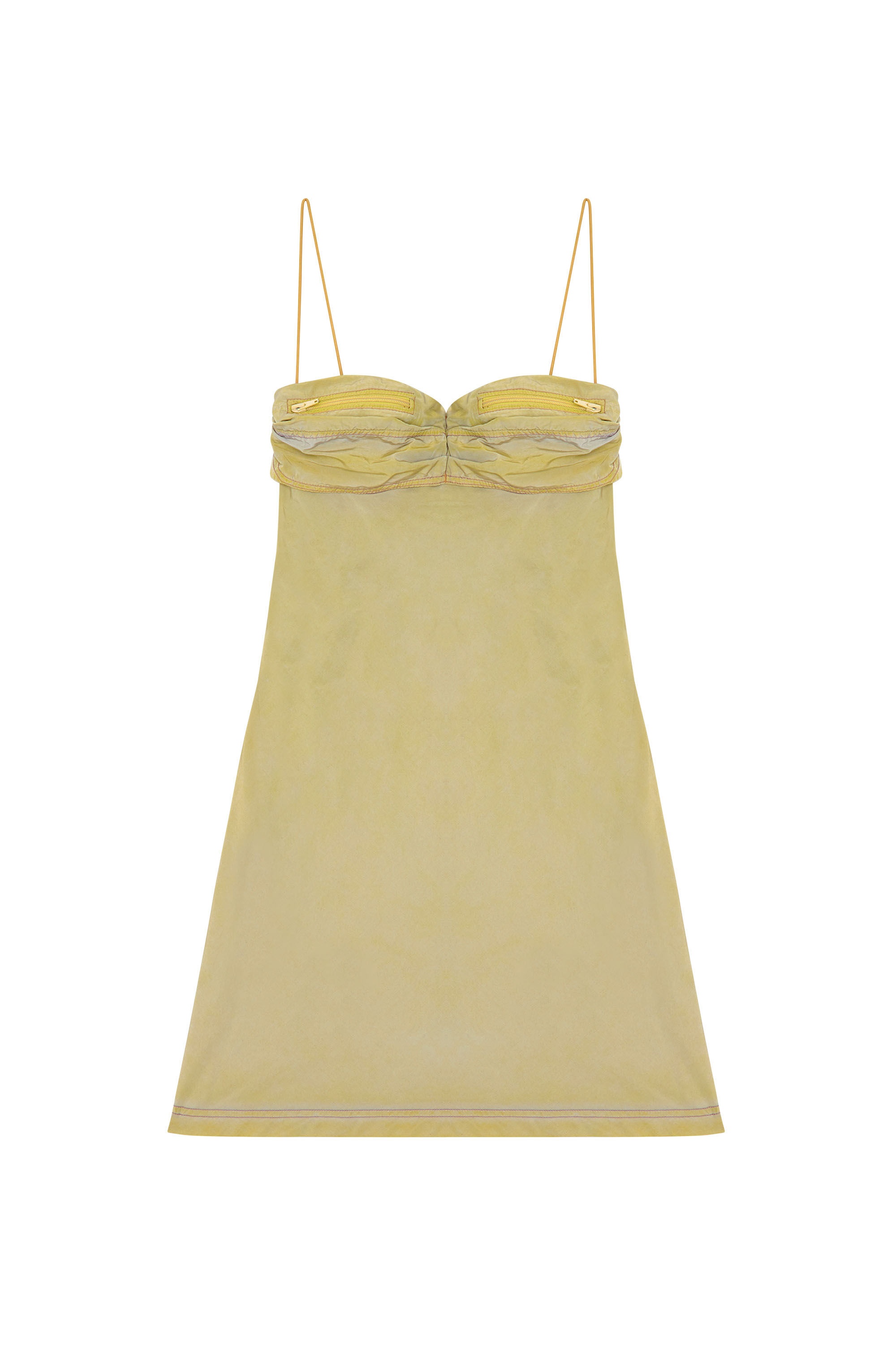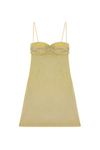Model is wearing an IT size 40 and is 175 cm / 5'7'' Fits true to size, take your normal size. This women’s SS24 Runway Show dress is an artisanal piece informed by utility. Cut to a mini length from subtly crimped woven fabric, it has pin-thin straps, a draped pocketed bra and a chunky buckled strap framing the back. The silhouette evolves through garment-dyeing and spray treatments, accumulating soft colour markings and jean-like whiskering.