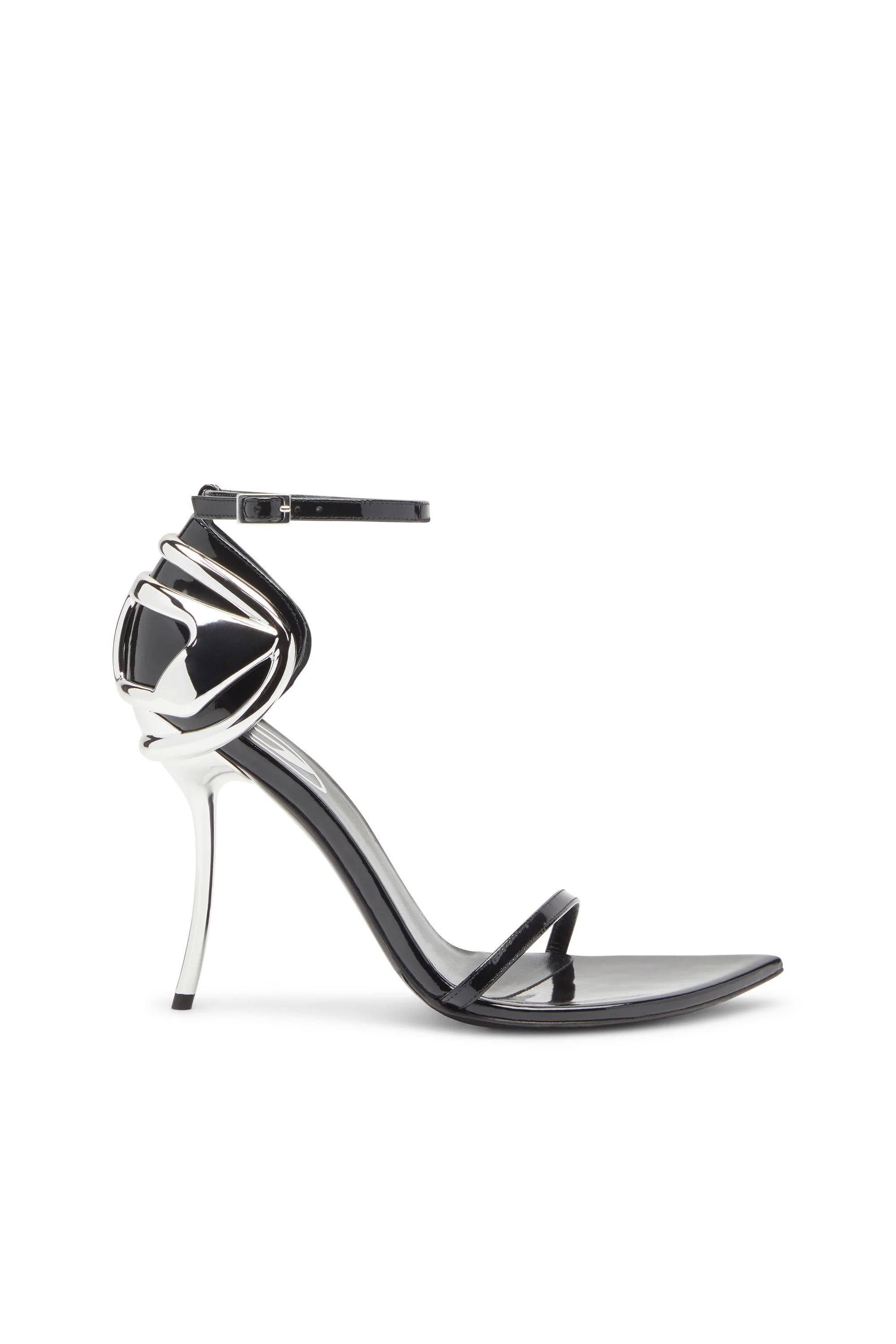 Product Description From the Diesel SS25 Runway Show, the exceptional D-Ten&Half stiletto sandal. Crafted from black patent leather, this women's vertiginous summer shoe channels high-octane glamour. Its two signature elements – the elegantly curved 10.5cm heel and moulded Oval D hardware wrapping the back – gleam with a metallic chrome-like shine. A delicate satin ankle strap and leather sole complete this exclusive design. ID: Y03662P4347 Materials & Details Composition: 100%Cow Leather Spring Summer 2025 Runway Show Adjustable buckled ankle strap Leather insole and outsole 10.5cm heel