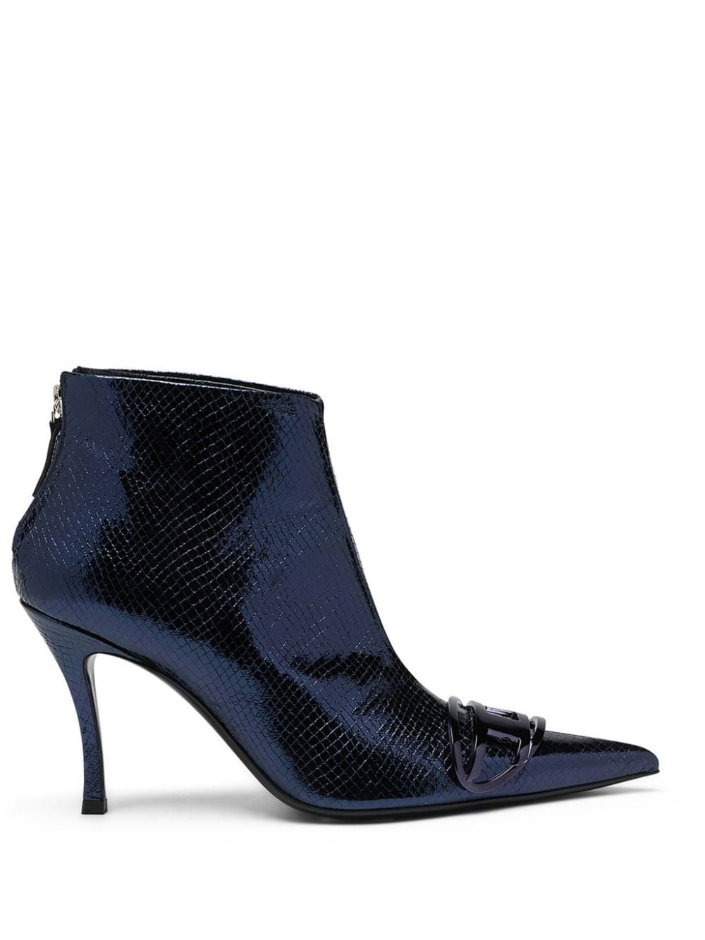 D-Venus 80mm leather ankle boots Diesel's D-Venus stiletto ankle boots are inspired by rave scenes from decades past. Theyâre crafted from metallic navy leather with a tactile snakeskin finish and branded with matching Oval D logo plaques at the sleek pointed toes. Highlights - Midnight blue - Leather - Snakeskin effect - Metallic finish - Rear zip fastening - Pointed toe - Oval d plaque at front - High stiletto heel Composition Lining: Polyurethane 100% Outer: Polyester 95%, Polyamide 5% Sole: Leather 100%