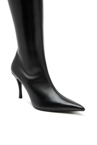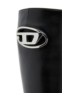 Product Description These women's knee-high boots are crafted from smooth black leather. Designed with a pointed toe and stiletto heel, this style is elevated with a side cut-out, fitted with a metal Oval D plaque. ID: Y03207P5088 Materials & Details Composition: 100%Cow Leather Side zip Kitten heel