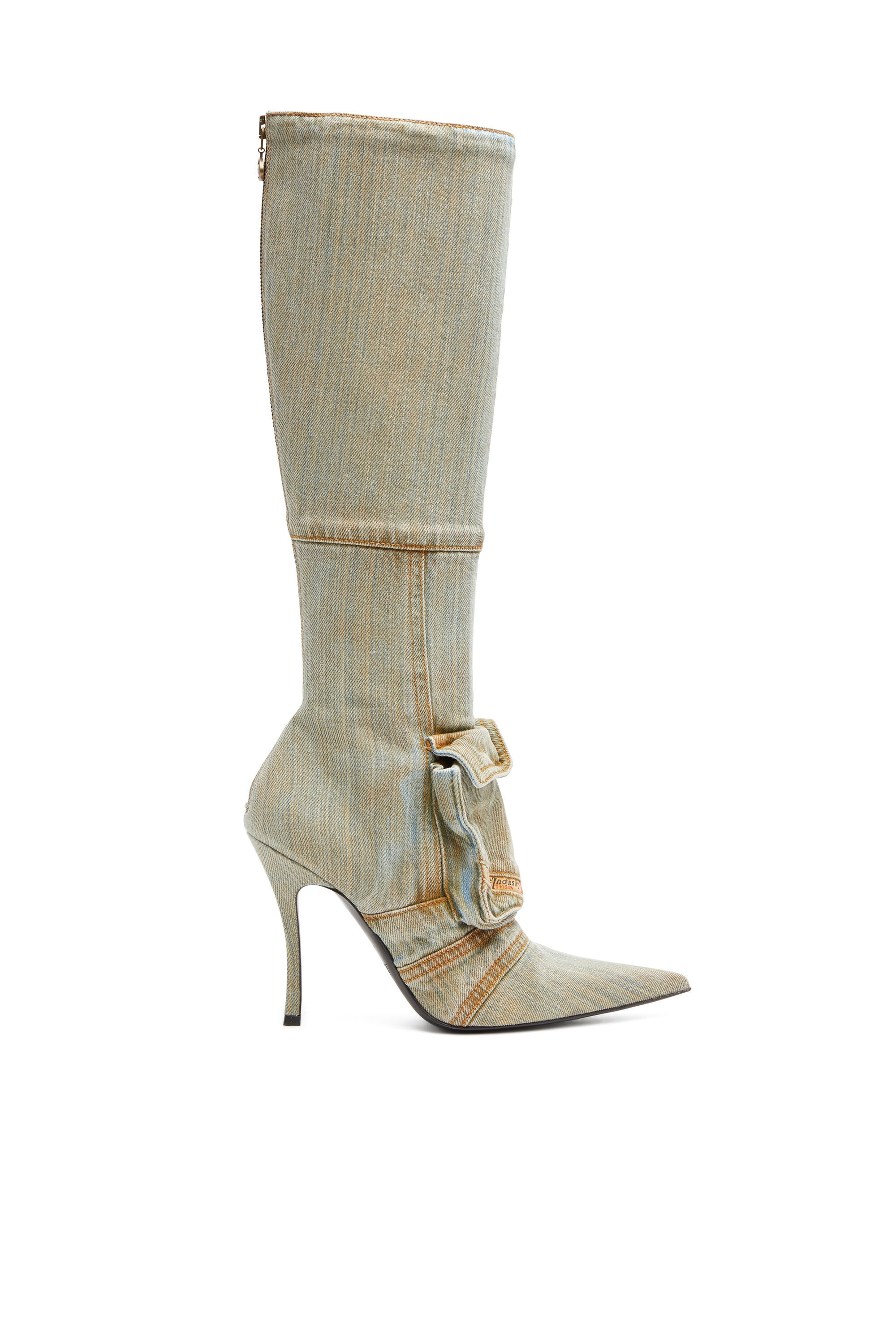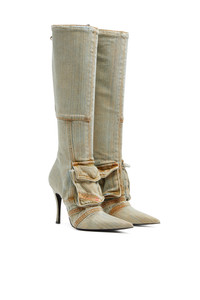 These women's knee-high boots form part of the Fall Winter 2023 Runway Show edit, built from blue denim with an innovative streaky treatment. Flaunting a pointed toe and stiletto heel, they're detailed with front flap pockets for a hint of Diesel's utility attitude. The brand's iconic fifth pocket detail rounds off the look.