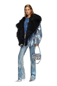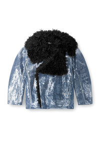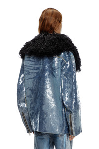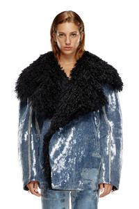 Product Description Inspired by a Runway style, this women's jacket is designed to look and feel relaxed, with oversized shaggy lapels in black. Lightly padded for warmth. It's crafted from marbled medium blue comfort denim, digitally printed with signature devore whiskers where the fabric naturally folds with wear. Entirely covered in shiny transparent sequins. It's crafted from marbled medium blue comfort denim, digitally printed with signature devore whiskers where the fabric naturally folds with wear. Entirely covered in shiny transparent sequins. ID: A144660PGAE Size & Fit Model is wearing a size S and is 175 cm / 5'7'' Check the size chart to choose the correct size. Materials & Details Composition: 99%Cotton 1%Elastane-Spandex Side pockets Zipped cuffs Hidden closure with hooks on collar Lined and padded