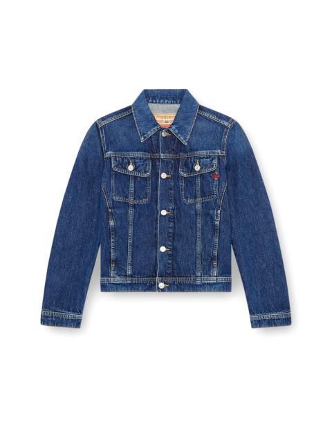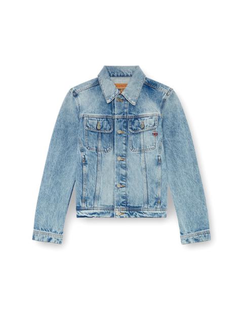 Product Description Women's denim jacket featuring a trucker silhouette, with buttoned chest pockets, side adjusters and buttoned cuffs. Crafted using partially recycled cotton, this fix denim fabric features a light blue wash with a clean finish. ID: A0997009I29 Size & Fit Model is wearing a size S and is 175 cm / 5'7'' Check the size chart to choose the correct size. Materials & Details Composition: 100%Cotton By buying cotton products from Diesel, you’re supporting responsible cotton production through "Better Cotton”. 4 pockets Button cuffs and waist adjusters Shank button closure