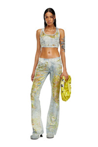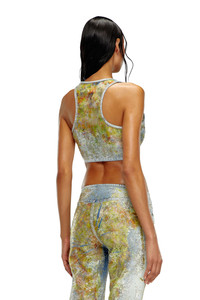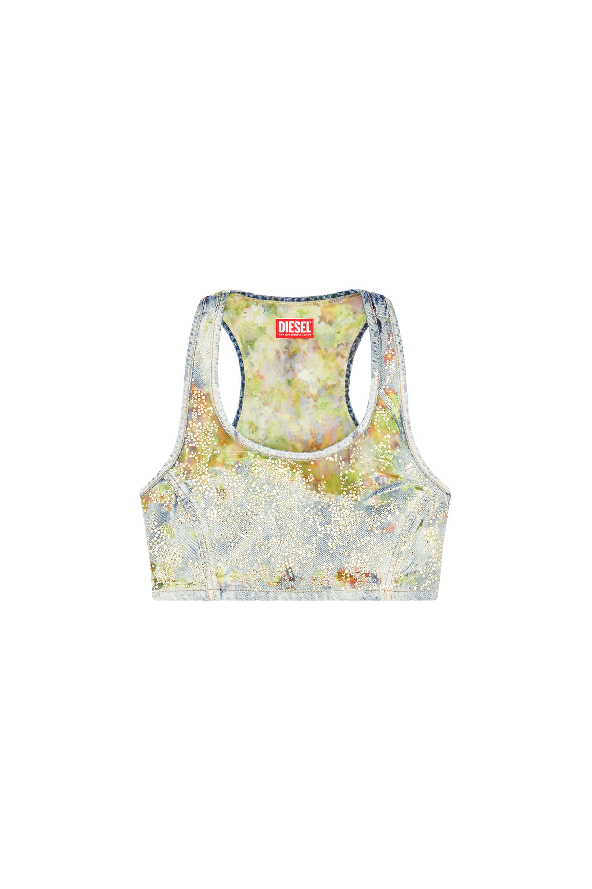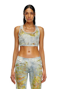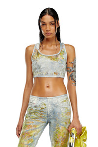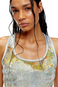 Model is wearing a size S and is 175 cm / 5'7'' Fits true to size, take your normal size. This cropped racerback top is a Spring Summer 2024 Runway Show piece. This light blue wash in fix denim expresses Diesel's elevated craftsmanship through signature dévoré workmanship and crystal detailing. Corrosions, strategically placed where the fabric naturally folds with wear, create a used vintage look with transparent detailing that reveals the inner fabric construction. An all-over flower print in tones of yellow, enriched with sparkling rhinestones, adds a precious graphic touch.
