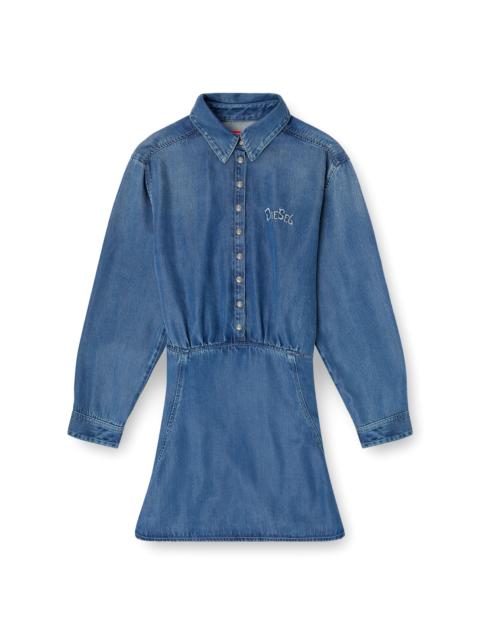 Product Description This mini dress is crafted from blue Lyocell denim with a light, fluid texture. The large embroidered patch on the back, featuring graffiti-style letters from the Diesel logo, makes it a unique statement piece. ID: A23669068XP Size & Fit Model is wearing a size S and is 175 cm / 5'7'' Check the size chart to choose the correct size. Materials & Details Composition: 100%Lyocell Shirt collar Buttoned top Large embroidered back patch Unlined