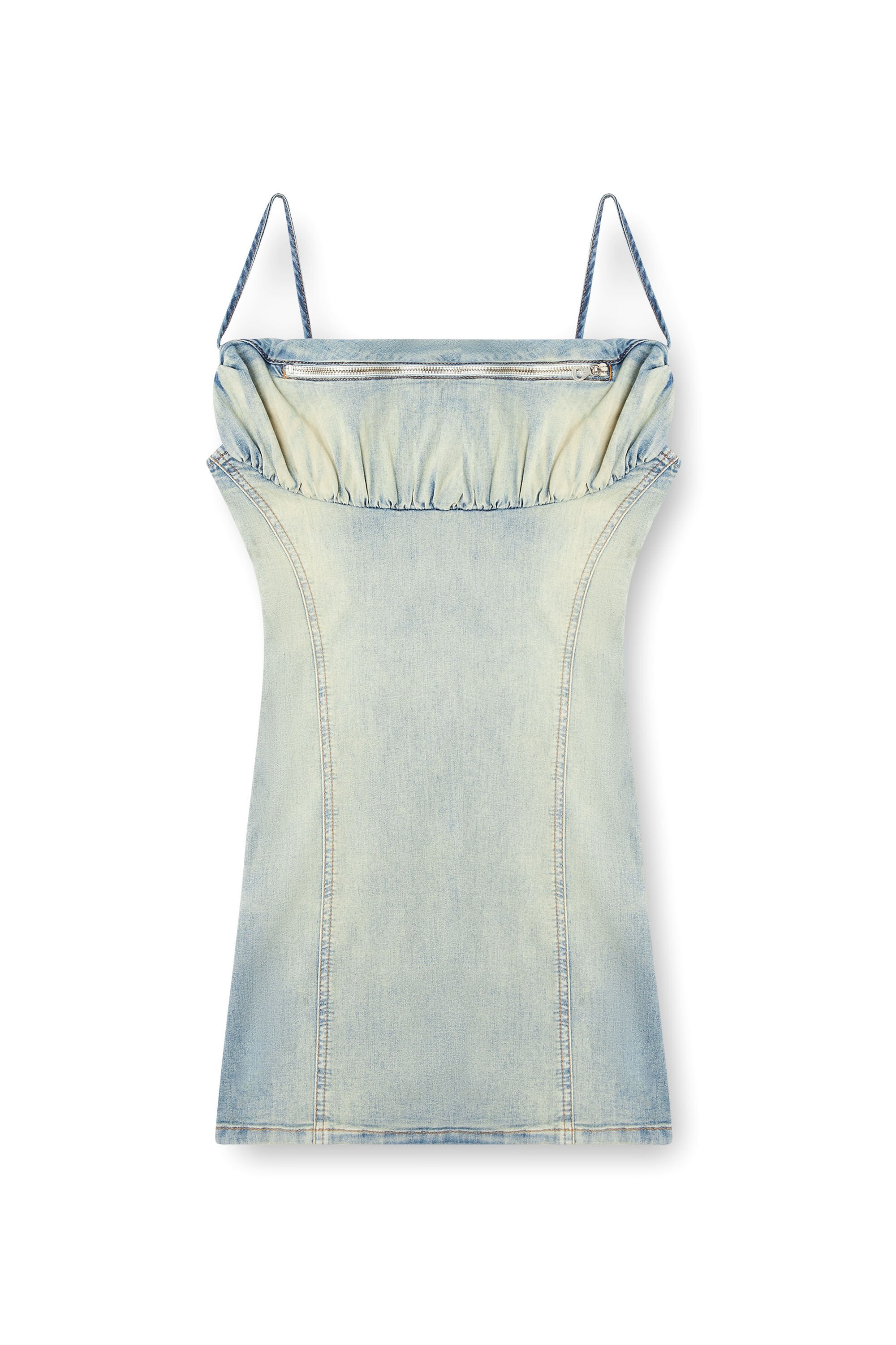 Product Description Short dress with a minimal silhouette, defined by a distinctive construction with a zipped belt bag design on the chest. The light-blue stretch denim features a bleach-effect wash with a subtle dirt finish. ID: A163090ABDD Size & Fit Model is wearing a size S and is 175 cm / 5'7'' Check the size chart to choose the correct size. Materials & Details Composition: 98%Cotton 2%Elastane-Spandex Adjustable straps Hidden zip closure Unlined