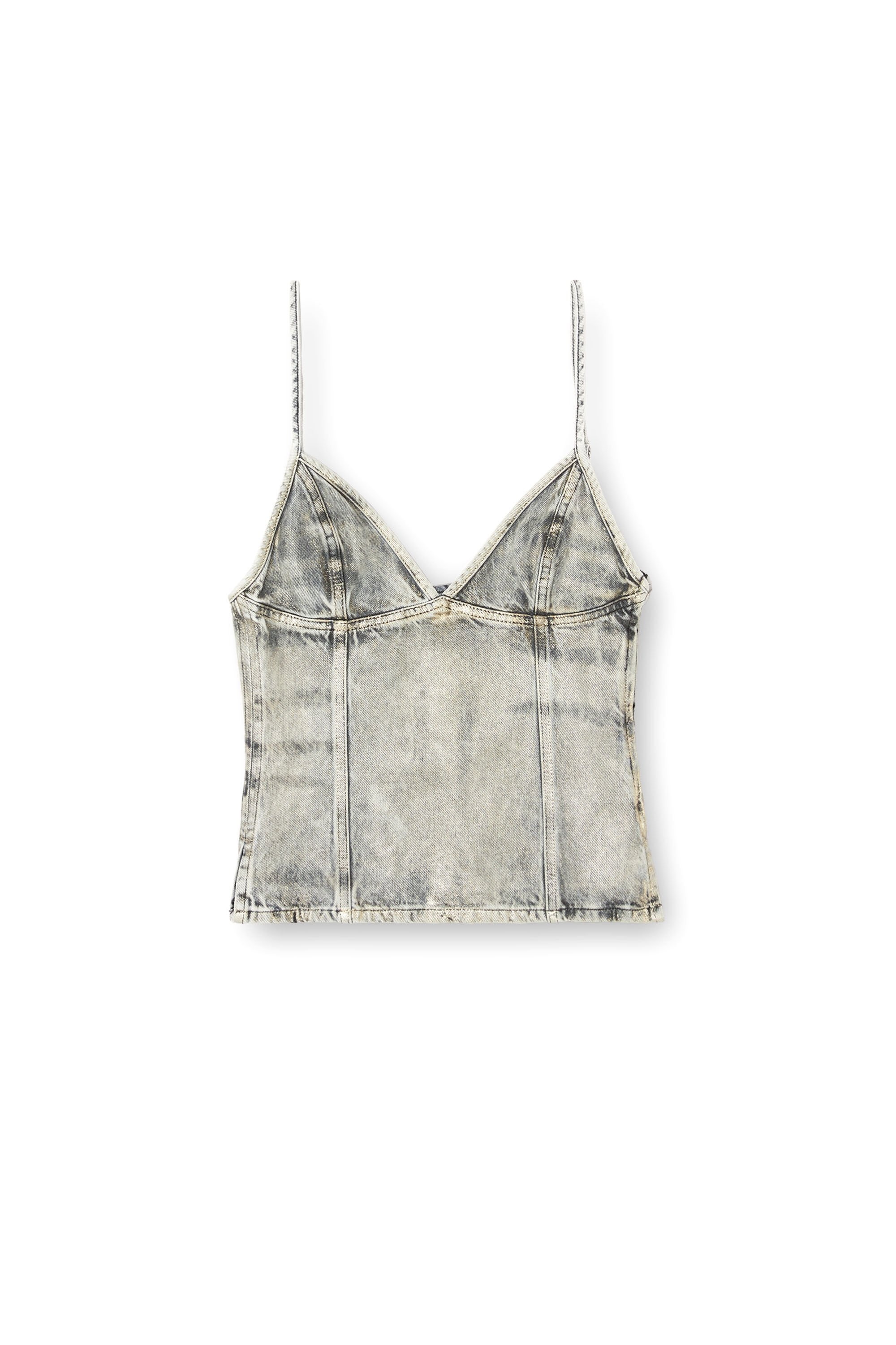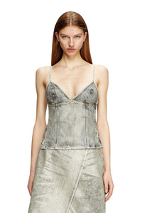 Product Description This women's top is designed with a close-fitting silhouette, triangle cups and thin adjustable shoulder straps. The grey fix denim is treated with a marble wash for a bleached effect. To highlight the nuanced finish, the garment is artfully decorated with shiny Mylar foil, and lasered where the fabric naturally folds with wear. The result is a high-octane take on Diesel's heritage denim looks. ID: A1684709L79 Size & Fit Model is wearing a size S and is 175 cm / 5'7'' Check the size chart to choose the correct size. Materials & Details Composition: 100%Cotton Adjustable shoulder straps Side zip closure