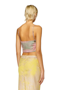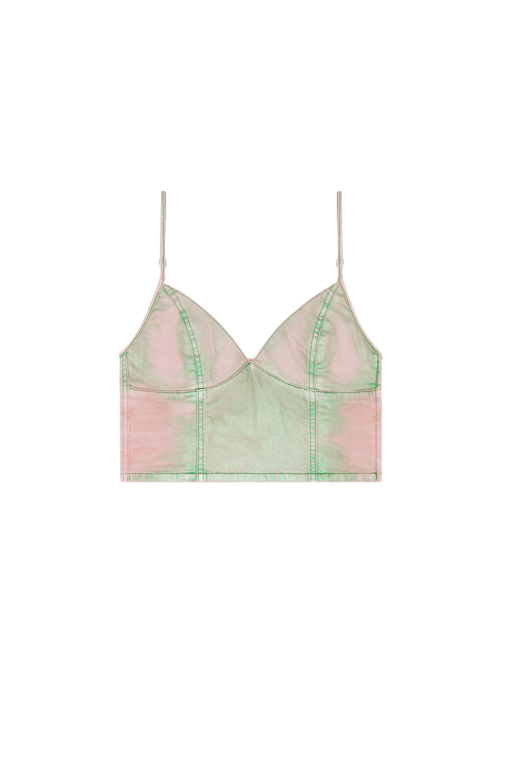 Model is wearing a size S and is 175 cm / 5'7'' Fits true to size, take your normal size. This crop top is designed with a close-fitting silhouette and thin shoulder straps. The side closure ensures an effortless fit. Made from stretch denim, it showcases a unique two-tone wash in pop hues. The fabric is laminated, dyed pink and laser treated to reveal the contrasting green tones along the seams.