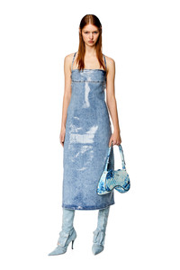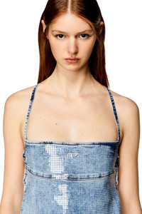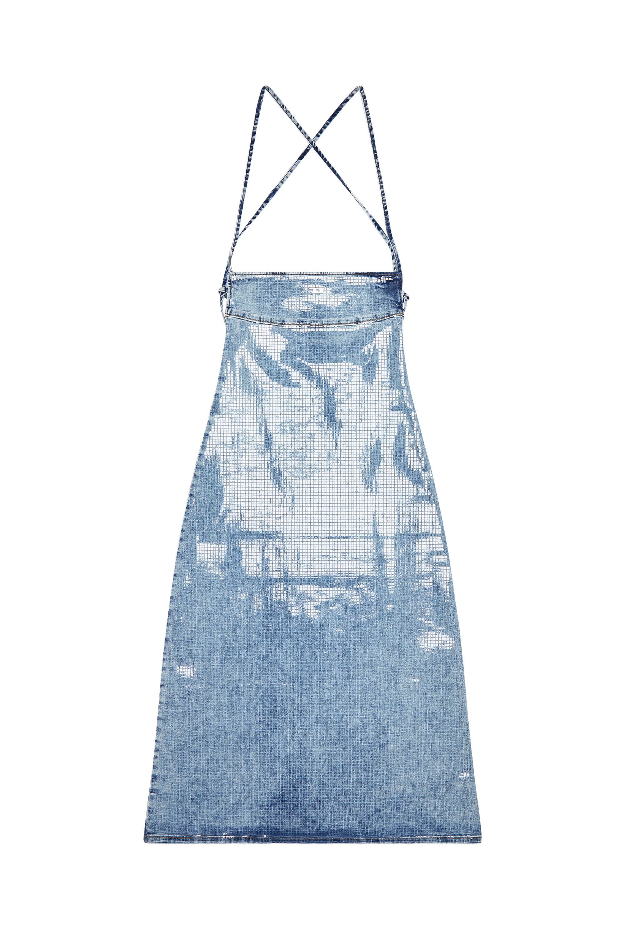 Model is wearing a size S and is 175 cm / 5'7'' Fits true to size, take your normal size. Women's midi dress featuring an open back and a slim silhouette. Detailed with a metal Oval D on the front and fastened with criss-cross straps on the back. This comfort denim offers a showstopping look that channels Diesel's experimental attitude. The light blue, slightly stretchy fabric is enriched by a special transparent film, pressed with a square-cut pattern that creates an all-over sequin effect.