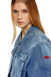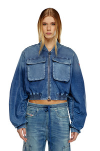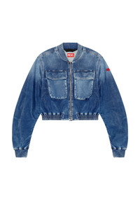 Model is wearing a size S and is 175 cm / 5'7'' Fits true to size, take your normal size. This zip-up bomber jacket features a relaxed silhouette with a cropped, stretchy waist. Two large patch pockets on the chest nod to workwear styes, while the slightly gathered seams on the sleeves and back yoke enhance the volume. It's made from Track Denim to express a cool, genderless attitude that nods to authentic street culture and 90s silhouettes. The medium blue wash is coated with a transparent film that creates a subtle, all-over sheen, highlighting the natural folds and construction of the style.