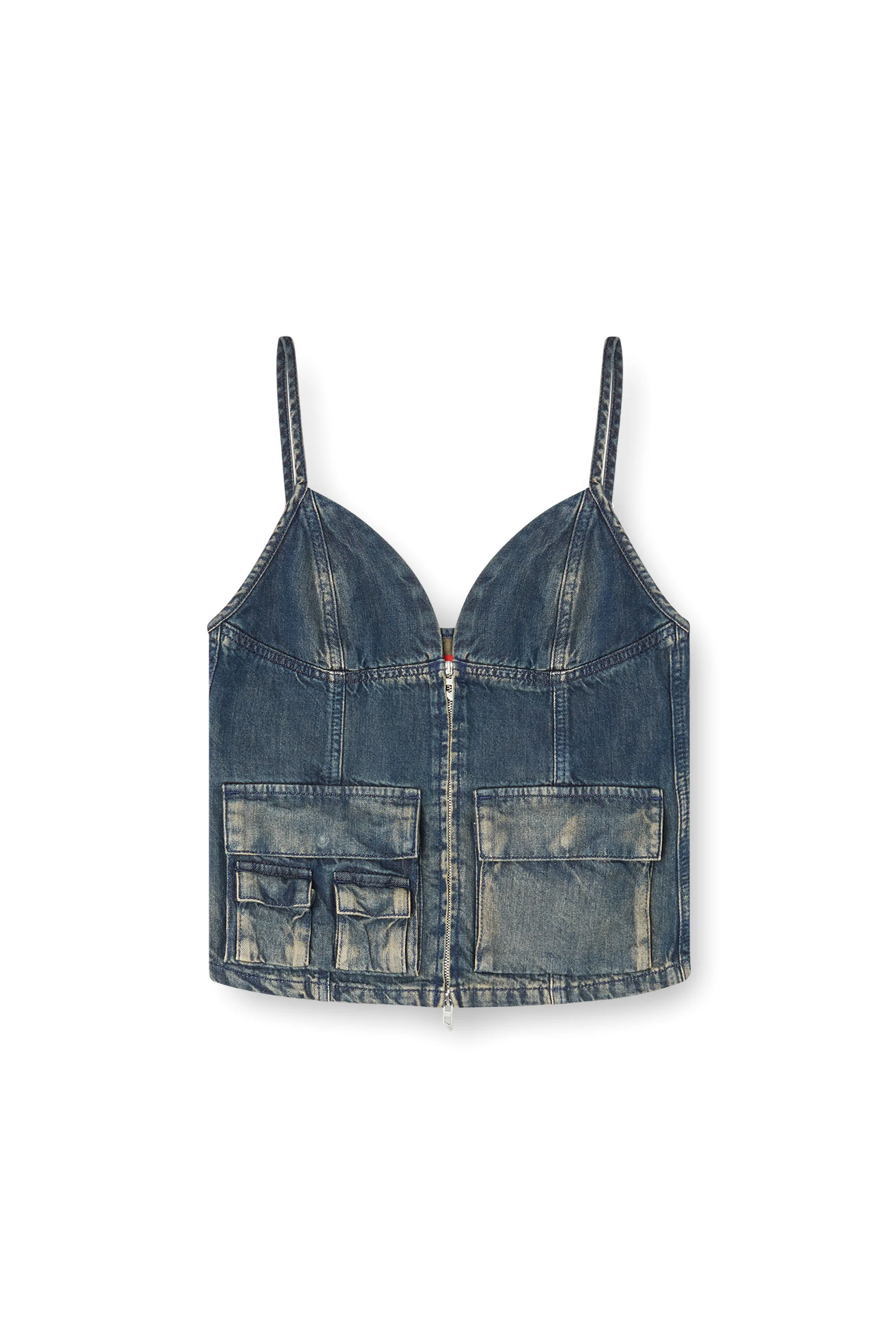 Product Description This women's top is designed with multiple utility-inspired pockets. The close-fitting silhouette features a front zip fastening, triangle cups and thin adjustable shoulder straps. An example of refined rawness, this dark blue fix denim is crafted from TENCEL™ Lyocell for a fluid feel. Laser-worn effects create subtle whiskers, while stone wash and spray treatments lend a gradient finish in sandy tones. Tonal stitching completes the look – a perfect balance of casual and cutting-edge. ID: A18322068TD Size & Fit Model is wearing a size S and is 175 cm / 5'7'' Check the size chart to choose the correct size. Materials & Details Composition: 100%Lyocell Zip closure