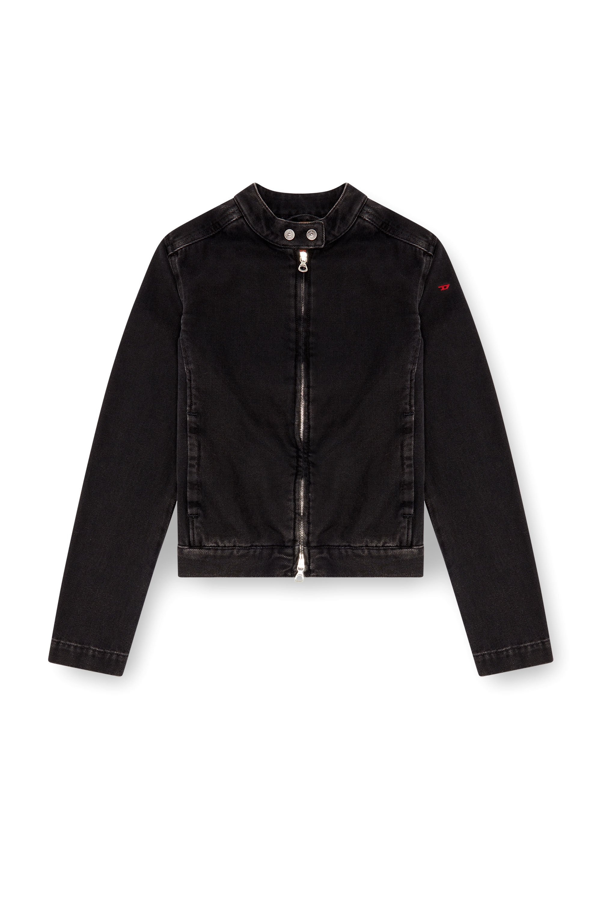 Product Description Inspired by biker silhouettes, this women's jacket is made from black fix denim in partly recycled cotton. The clean, essential silhouette is detailed with a small D embroidered in red thread on one sleeve. This fix denim is made using partially recycled cotton and features a black wash with a clean finish. It's part of the DNA selection of essential, heritage styles. ID: A1343409I35 Size & Fit Model is wearing a size S and is 175 cm / 5'7'' Check the size chart to choose the correct size. Materials & Details Composition: 100%Cotton Round snap-button collar Zip closure Unlined