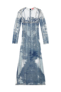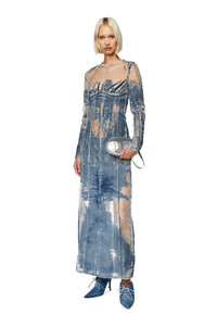 Model is wearing a size S and is 175 cm / 5'7'' Fits true to size, take your normal size. This Fall Winter 2023 Runway Show dress is cut to a body-grazing silhouette, enhanced by a unique corrosion workmanship that creates skin-baring effects. It features a round neckline, long sleeves and a maxi skirt with a deep back slit. Made from fix denim, this medium blue wash epitomises Diesel's creativity through an elevated devoré workmanship. The see-through finish reveals the construction of the piece, creating a mesh-like finish on the most worn-out areas of the garment.