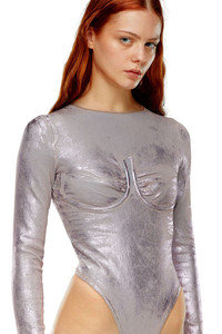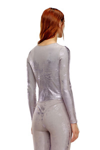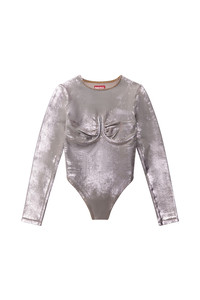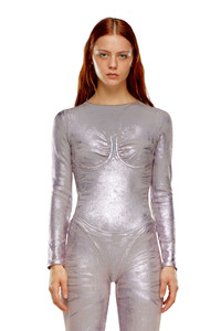 Model is wearing a size S and is 175 cm / 5'7'' Fits true to size, take your normal size. Fresh from the Spring Summer 2024 Runway Show, this women's long sleeve bodysuit is an emblem of Diesel's experimental workmanship. Bra-shaped stitching and a high-leg cut define the design. This pop-colour wash is crafted from super-stretch denim that fits the body like a second skin. The overdyed bi-stretch fabric is enriched with a dedicated artwork treatment, recreating whiskers and used effects where it naturally folds with wear. The shimmering finish comes from a sheet of Mylar foil, pressed on the fabric to enhance the vintage effects and lend a luminous finish.