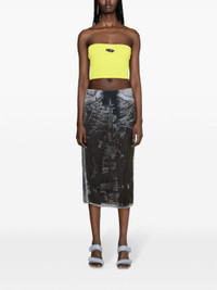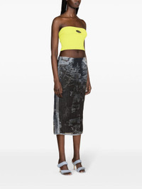 black/blue cotton blend denim devoré effect pinstripe pattern layered design mid-rise side zip fastening two side inset pockets rear slit straight hem mid-length Size & Fit Model Measurements: Height: 1.8 m Bust/Chest: 87.0 cm Hips: 91.0 cm Waist: 63.0 cm Model wears size 26 Fabric and Care Designer Style ID: A14512068MU Designer Colour: 01 BLACK/BLUE Composition: Outer: Nylon 22%, Cotton 78%; Lining: Polyester 100% Washing instructions: Hand Wash Made in Tunisia