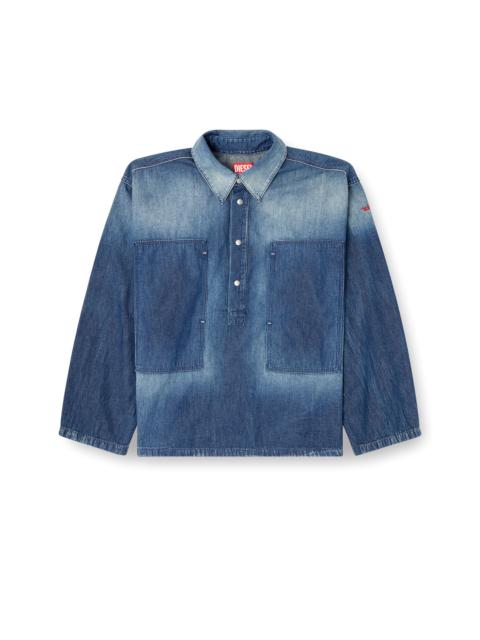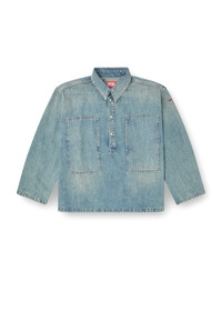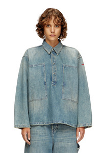 Product Description This women's long-sleeve top is cut to a boxy fit. It features a polo neckline with branded metal snap buttons, and wide patch pockets on the chest that open on the side. A small red D logo is embroidered on one sleeve. Utility vibes are a hallmark of Diesel's urban, workwear-inspired aesthetic. Made with a high percentage of regenerative cotton, this light blue wash is crafted from fix denim with a clean, contemporary finish. ID: A19265068SK Size & Fit Model is wearing a size S and is 175 cm / 5'7'' Check the size chart to choose the correct size. Materials & Details Composition: 100%Cotton Polo collar with metal snap buttons Buttoned cuffs