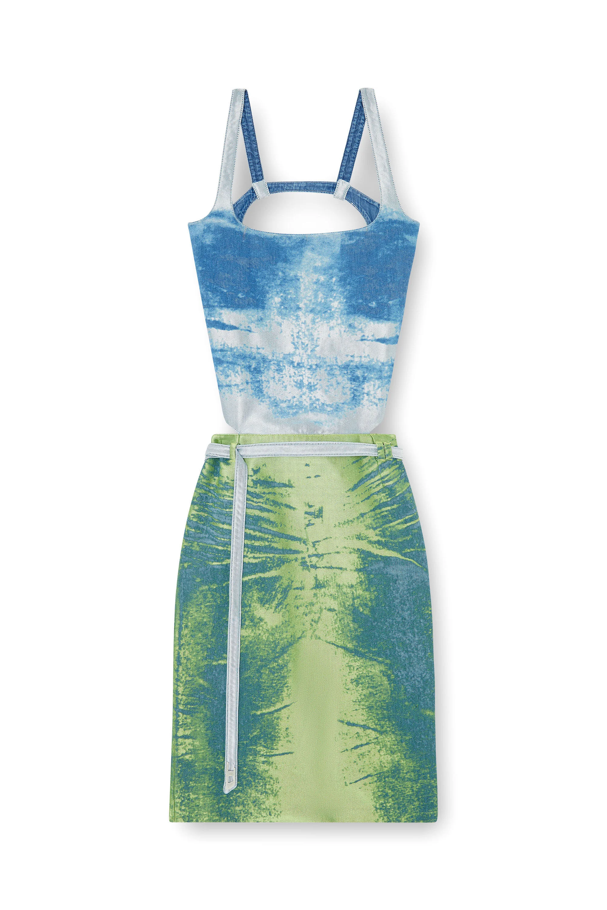Product Description Showcasing the SS26 Runway Show's combination of experimentation, wearability, and play, this midi apron dress is designed with a square neckline and strap-framed open back. At the waist, a long self-tie strap — tipped with a metal D logo — delivers a deconstructed biker cue, ready to knot, wrap or let hang loose. The vivid-coloured wash is crafted from satin denim – an exclusive made in Italy fabric – with a refined, high-shine surface in recycled polyester that conceals a traditional denim core. Jacquard techniques and laser treatments reveal distressed textures and Diesel’s signature whisker artwork, while innovative dry washes enhance softness. Finished with jewel-like resin-coated buttons and double D rivets, this couture-inspired piece blends Diesel's heritage style codes with bold experimentation. ID: A225190EFDK Size & Fit Model is wearing a size S and is 175 cm / 5'7'' Check the size chart to choose the correct size. Materials & Details Composition: 80%Cotton 20%Polyester Spring Summer 2026 Runway Show Shoulder straps Waist with belt loops and long self-tie belt Snap buttons at open back Lined in Lyocell