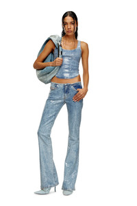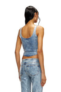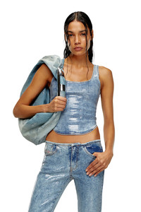 Model is wearing a size S and is 175 cm / 5'7'' Fits true to size, take your normal size. This slim-fit sleeveless top features a scoop neckline and rounded hems. Detailed with a metal Oval D on the back. This comfort denim offers a showstopping look that channels Diesel's experimental attitude. The light blue, slightly stretchy fabric is enriched by a special transparent film, pressed with a square-cut pattern that creates an all-over sequin effect.