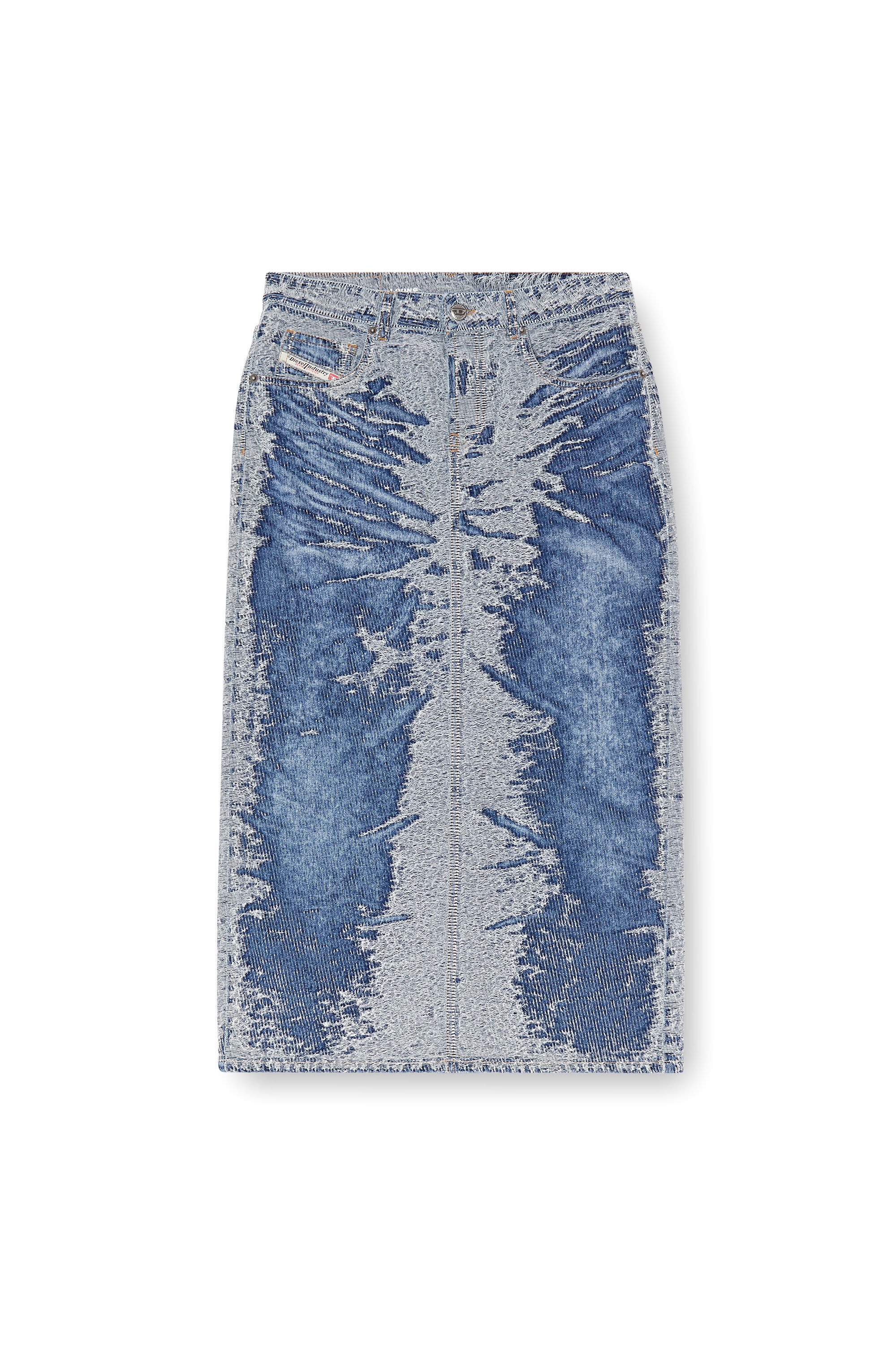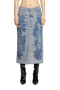 Product Description A classic 5 pocket style, this women's skirt features a straight, midi silhouette with a deep back slit. Diesel's innovative vision and artisanal expertise are perfectly showcased in this fix-fabric wash. Featuring a medium blue hue, it's defined by a blend of denim and jacquard: the upper layer of the fabric is intentionally lasered to obtain a distressed look that imitates classic whiskering, combining the authenticity of denim and artful workmanship. ID: A17063007W4 Size & Fit Model is wearing a size 26 and is 175 cm / 5'7'' Check the size chart to choose the correct size. Materials & Details Composition: 100%Cotton Five-pocket style