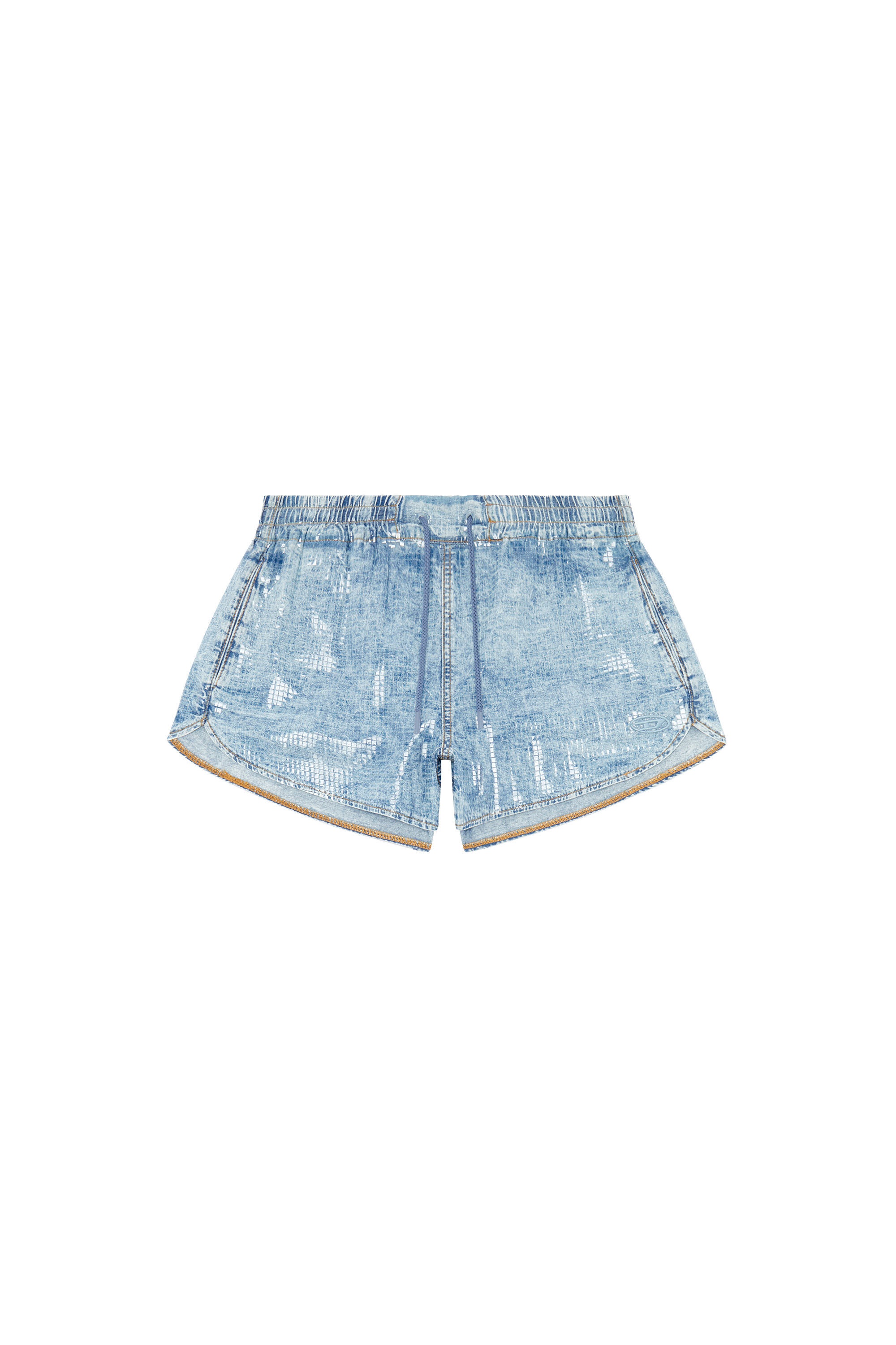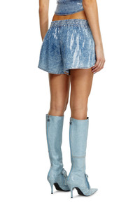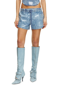 Model is wearing a size S and is 175 cm / 5'7'' Fits true to size, take your normal size. Women's shorts designed with a sporty silhouette, featuring a stretchy drawstring waist and slightly rounded hems. The fix denim offers a showstopping look that channels Diesel's experimental attitude. The light blue fabric is coated with a special transparent film, pressed with a square-cut pattern that creates an all-over sequin effect.