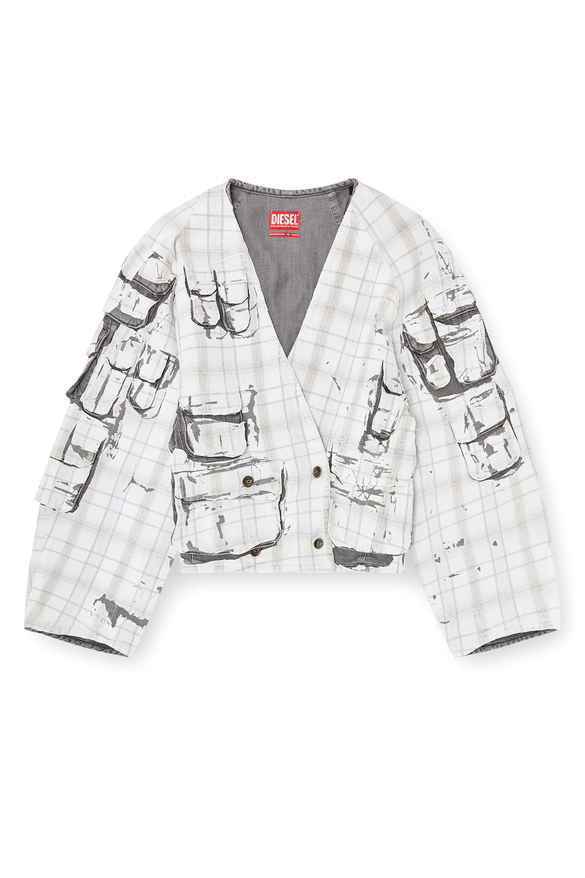 Product Description Characterised by a relaxed, cardigan-style silhouette, this women's jacket is a standout piece from the Spring Summer 2026 Runway Show. Three-dimensional patch pockets are placed all-over for added volume, while a half belt defines the waist on the back. This conceptual wash features a check-printed jersey overlay fused onto a fluid denim base through a unique process. The stone-washed denim beneath is partially revealed by laser-traced artwork and tactile peel-off effects, symbolically referencing the “animal within you.” Distressed in Italy, this elevated piece blends haute-couture flair with Diesel’s subversive denim experimentation. ID: A23423068WA Size & Fit Model is wearing a size S and is 175 cm / 5'7'' Check the size chart to choose the correct size. Materials & Details Composition: 60%Lyocell 40%Cotton, Application 90%Cotton 10%Elastane-Spandex Spring Summer 2026 Runway Show Double-breasted closure Multiple cargo pockets Martingale belt Lined in Lyocell