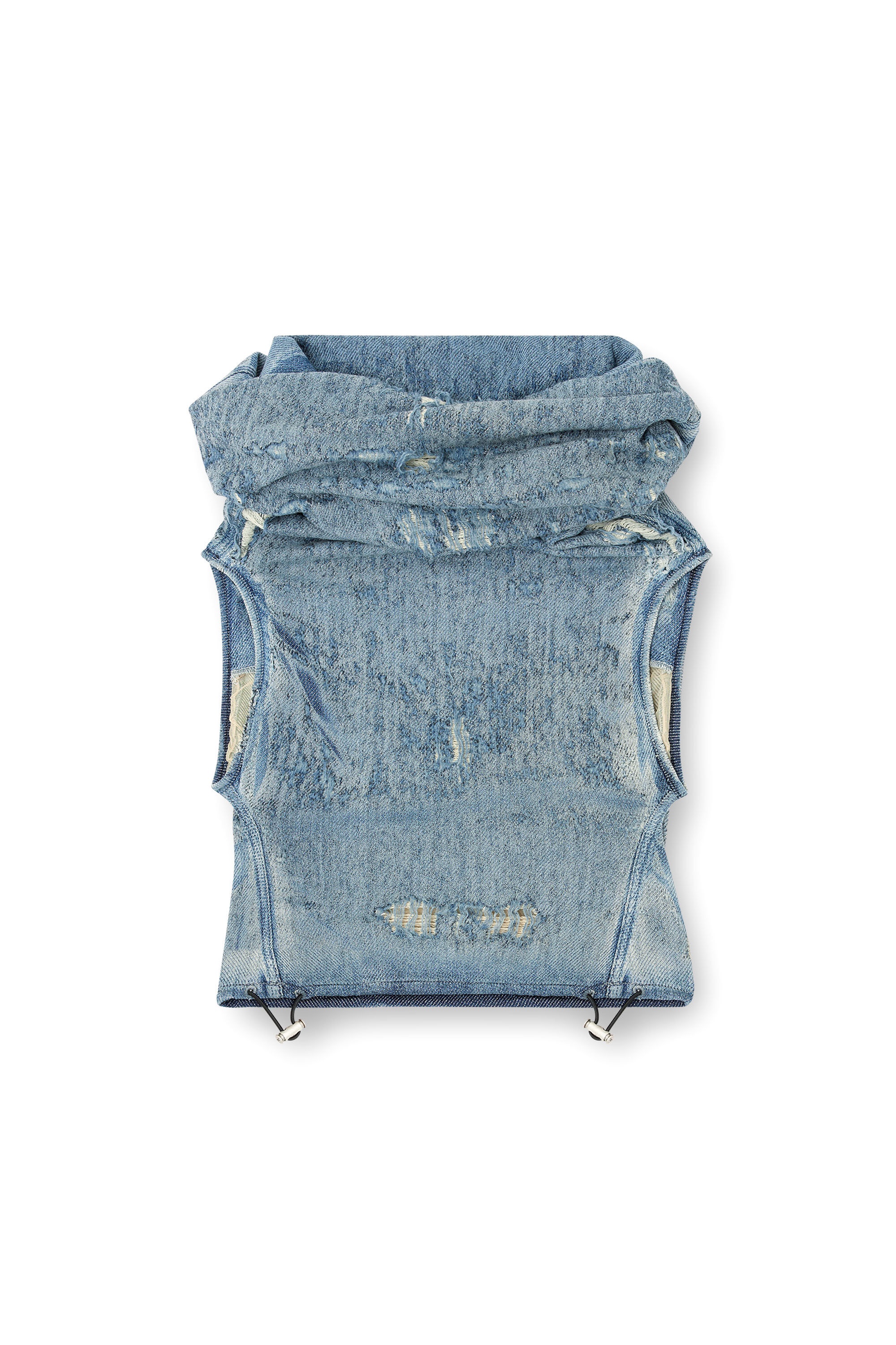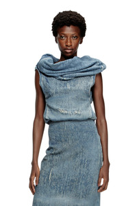 Product Description This women's sleeveless top features a super relaxed silhouette with a draped neckline that can also be worn as a hood. Crafted using a percentage of organic cotton, this ultra-distressed wash is the perfect example of finding beauty in what is destroyed – a key theme of the Spring Summer 2025 Runway Show. The jacquard fabric is woven on a double loom, creating a particular warp and weft construction that reverses the look of traditional denim: long indigo threads stand out on the front, while the white threads remain on the inside. This unexpected contrast adds depth and dynamism to the style. ID: A18944068RQ Size & Fit Model is wearing a size S and is 175 cm / 5'7'' Check the size chart to choose the correct size. Materials & Details Composition: 89%Cotton 10%Polyester 1%Elastane-Spandex Spring Summer 2025 Runway Show Transformable silhouette