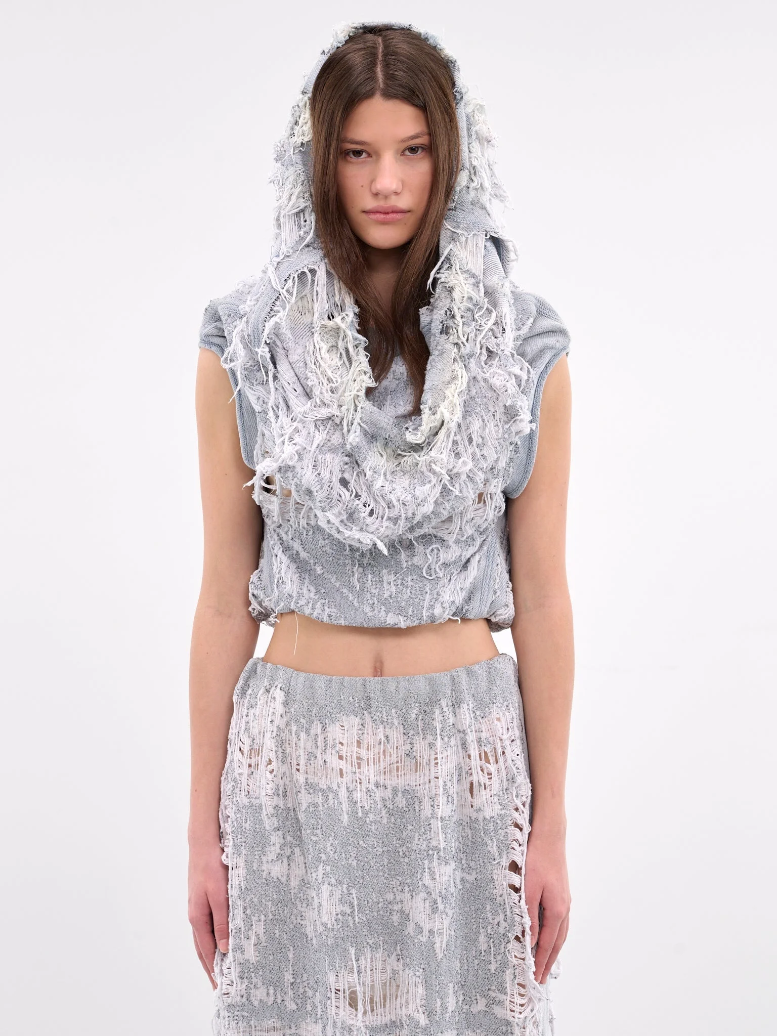 DIESEL top in light blue, limited edition 40th Anniversary design, paneled construction, all-over distressing, hood, front draping, sleeveless, armscyes, asymmetric hem, relaxed fit. Standard Sizing Model is 5'8" wearing size S. Bust: 31" Waist: 23.5" Hips: 34"