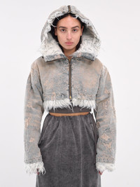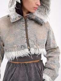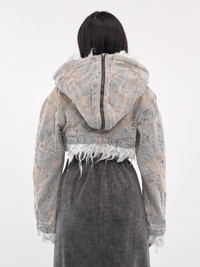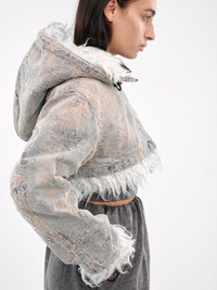 DIESEL jacket in blue, paneled construction, devore denim trompe l'oeil print, full-zip hood, front exposed two-way zip closure, long sleeves, straight hem, cropped length, shearling lining, relaxed fit. European Sizing Model is 5'6" wearing size 38. Bust: 31" Waist: 24" Hips: 34"