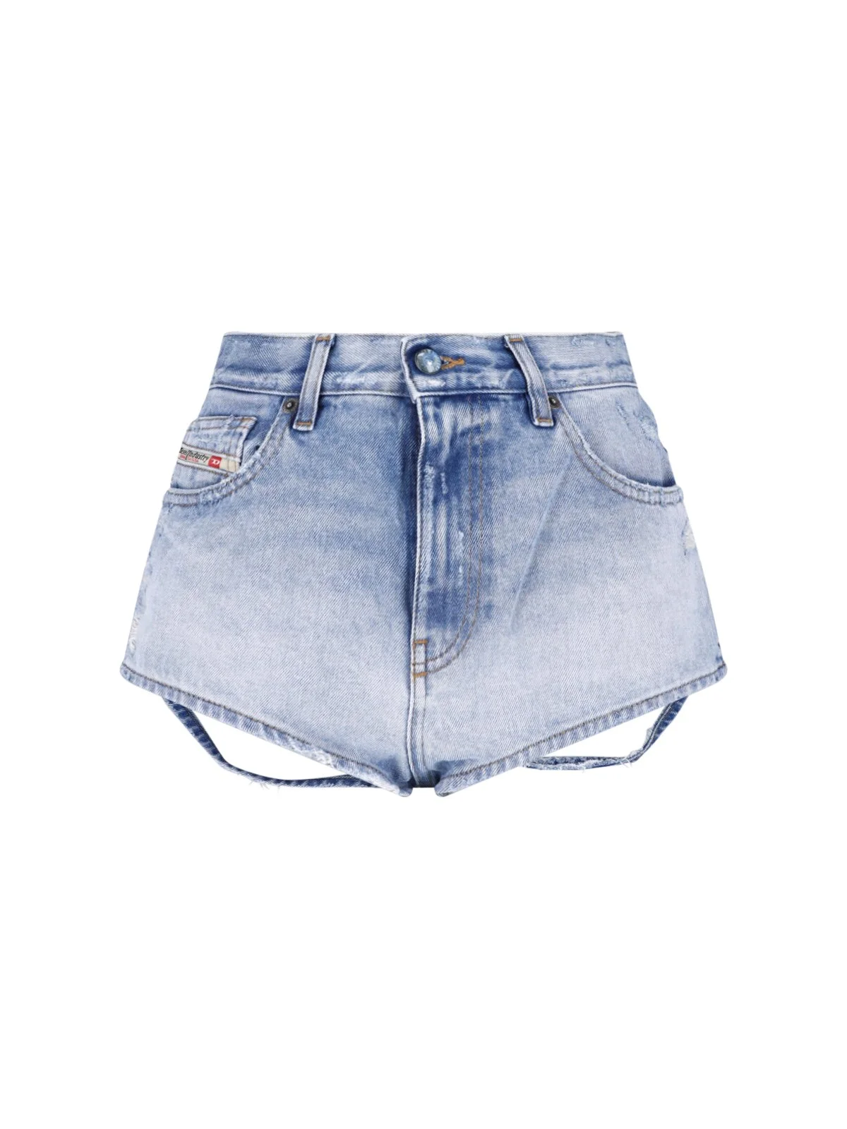 - BLUE COTTON DENIM SHORTS "DE-LUNAR" DIESEL - MID-RISE - FIVE-POCKET DESIGN - BELT LOOPS - MULTICOLOR LOGO TAG ON THE FRONT - DESTROYED DETAILS ON THE BACK PRODUCT INFO PRODUCT CODE A03557 007DM01 COMPOSITION: 100% COTTON SIZE AND FIT: REGULAR FIT MADE IN: TUNISIA