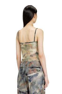 Product Description Skinny fit top made from stretch nylon with spaghetti straps and an all-over camouflage-inspired print, featuring contrast color external coverstitching. The garment is embellished with random transparent crystal applications that create a water drops effect and is finished with a small metal plaque on the back. ID: A211900JMBE Size & Fit Model is wearing a size S and is 175 cm / 5'7'' Check the size chart to choose the correct size. Materials & Details Composition: 80%Polyamide-Nylon 20%Elastane-Spandex Spaghetti straps and skinny fit All-over camou print Contrast external coverstitching Metal plaque on the back Transparent crystal details with water drops effect