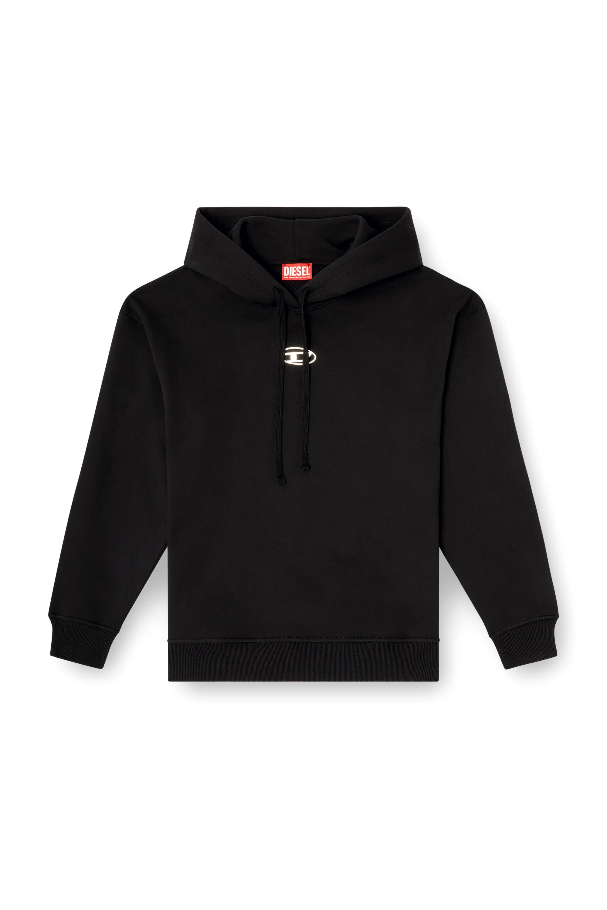 Product Description Women's black hoodie in loopback jersey, crafted using organic cotton. This style is cut for a relaxed fit and embellished on the front with the iconic Oval D – the silver chrome logo is created using an injection moulding technique and mimics the look of a metal plaque. ID: A194480BMBJ Size & Fit Model is wearing a size S and is 175 cm / 5'7'' Check the size chart to choose the correct size. Materials & Details Composition: 100%Cotton, Rib 96%Cotton 4%Elastane-Spandex Relaxed fit Drawstring hoodRibbed cuffs and hem