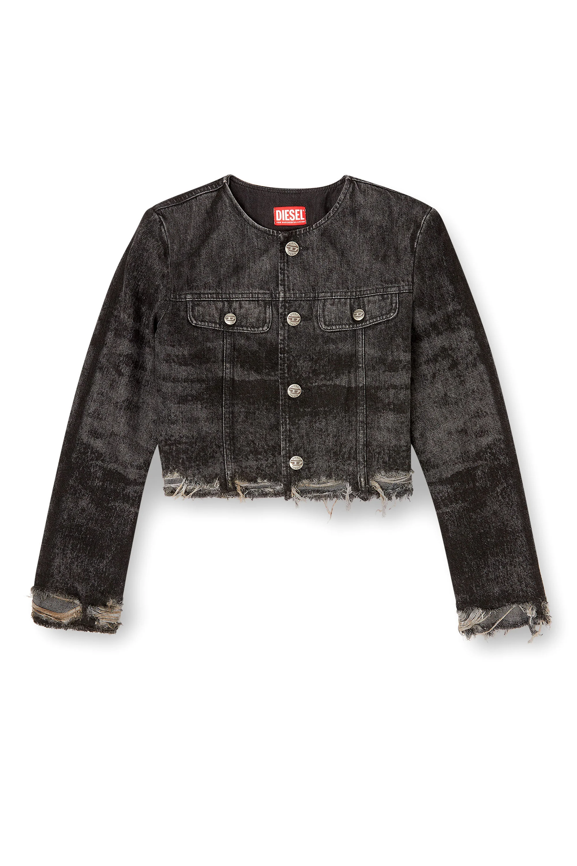 Product Description This women’s jacket is a tailored take on classic trucker silhouettes. In keeping with the elevated yet disrupted spirit of the Fall Winter 2025 Runway collection, the cropped and collarless silhouette is detailed with heavy fraying. Crafted from a blend of cotton and hemp, this dark grey fix denim is stone washed and treated with bold lasered artwork – iconic graphic motifs that lend an extreme, instantly recognisable touch. The result is a distinctive Runway wash that showcases Diesel's creativity and craftsmanship. ID: A21616007DB Size & Fit Model is wearing a size S and is 175 cm / 5'7'' Check the size chart to choose the correct size. Materials & Details Composition: 80%Cotton 20%True Hemp Fall Winter 2025 Runway Show Metal button closure Buttoned chest pockets Lined