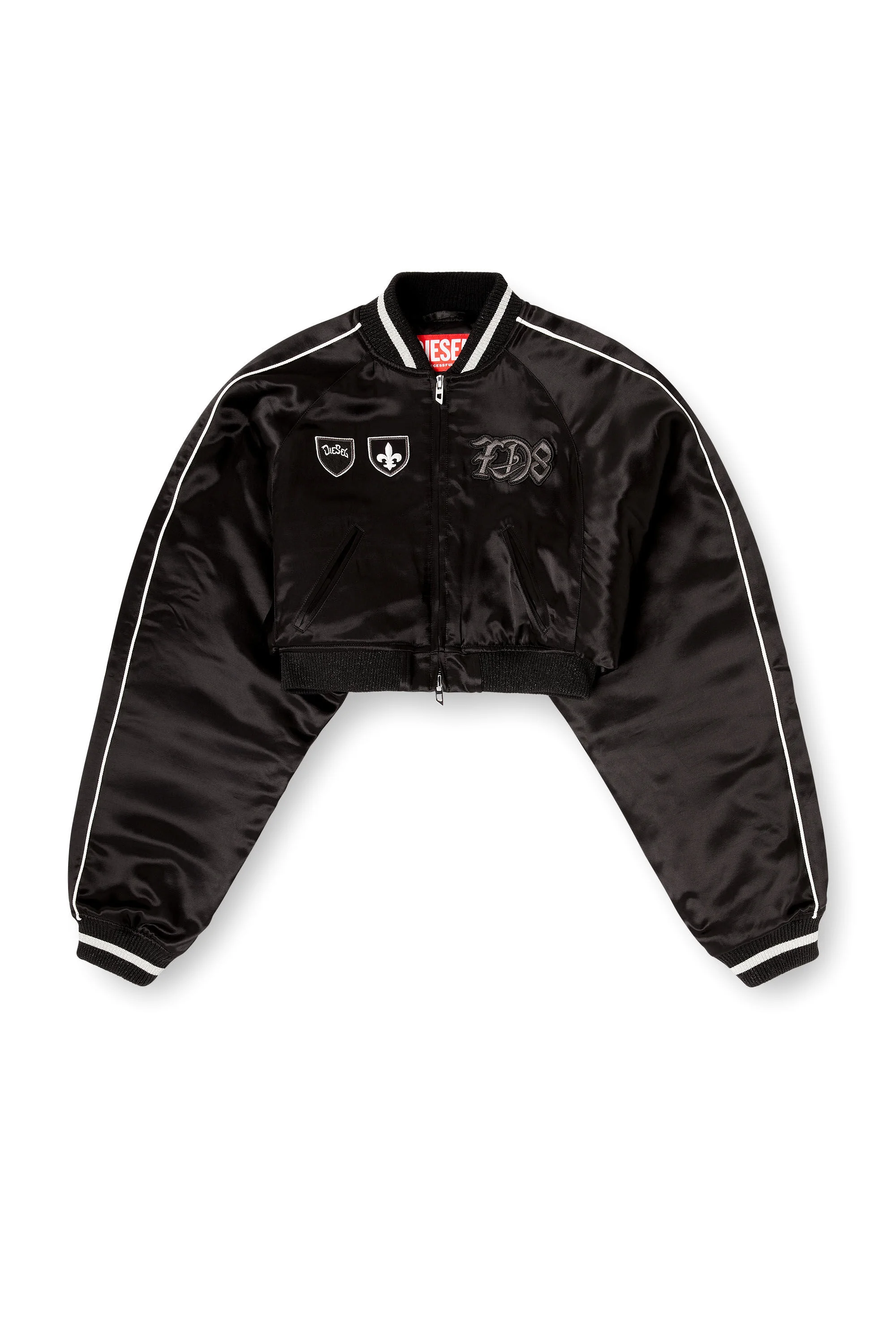 Product Description This women's satin bomber jacket features a cropped silhouette, accented with ribbed trims and contrast piping on the sleeves. Featuring a lightly padded internal lining, the jacket features signature DSL patches and embroideries on the front and back. ID: A235930PLCF Size & Fit Model is wearing an IT size 40 and is 175 cm / 5'7'' Check the size chart to choose the correct size. Materials & Details Composition: 100%Viscose-Rayon, Rib 97%Polyester 3%Elastane-Spandex, Embroidery Yarn 100%Polyester Lined and lightly padded Ribbed neck and cuffs Side pockets Snap button closure