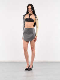 DIESEL skirt in grey, paneled construction, glen plaid pattern, high waist, front cut-out & metal logo plaque, side concealed zip closure, curved hem, mini-length, slim fit. Italian Sizing Model is 5'8" wearing size 40. Bust: 32" Waist: 26" Hips: 34.5"