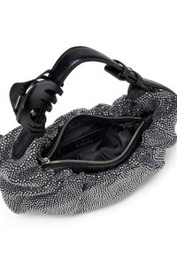 Product Description Women’s small handbag with a slouchy hobo silhouette. Gathered along the zip for a scrunched effect, this exclusive FW25 Runway Show piece is crafted from black-wash denim embellished with light-catching crystals. The innovative belt-inspired handle accessorised with a hair clip is a signature detail of this style. The handle extends into a dangling strap, showcasing the resin Oval D at the tip. Carry it by the top handle or over the shoulder. ID: X10479P8641 Materials & Details Composition: 75%Cotton 25%Polyurethane Fall Winter 2025 Runway Show Adjustable belt-like strap Zip closure Removable hair clip