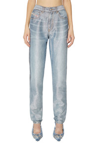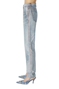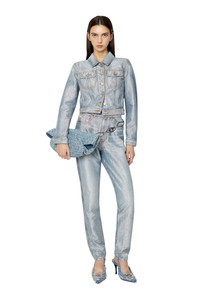 PRODUCT ID: A0361209E47 - 70%Cotton 20%Viscose-Rayon 10%Polyester - Straight - Slim - High waist - Medium treated - Non-Stretch - Medium blue - Zip fly Model is wearing a size 26 and is 175 cm / 5'7'' Fits true to size, take your normal size. Slim style with a high waist and straight leg. Nodding to '90s silhouettes, this jean channels an original Denim attitude and is finished with a zip fly. Crafted from fix denim that is entirely made in Italy, this medium blue wash features a silver lurex jacquard weave that confers a subtle metallic touch. The fabric is used inside out, and finished with lasered and handmade abrasions.