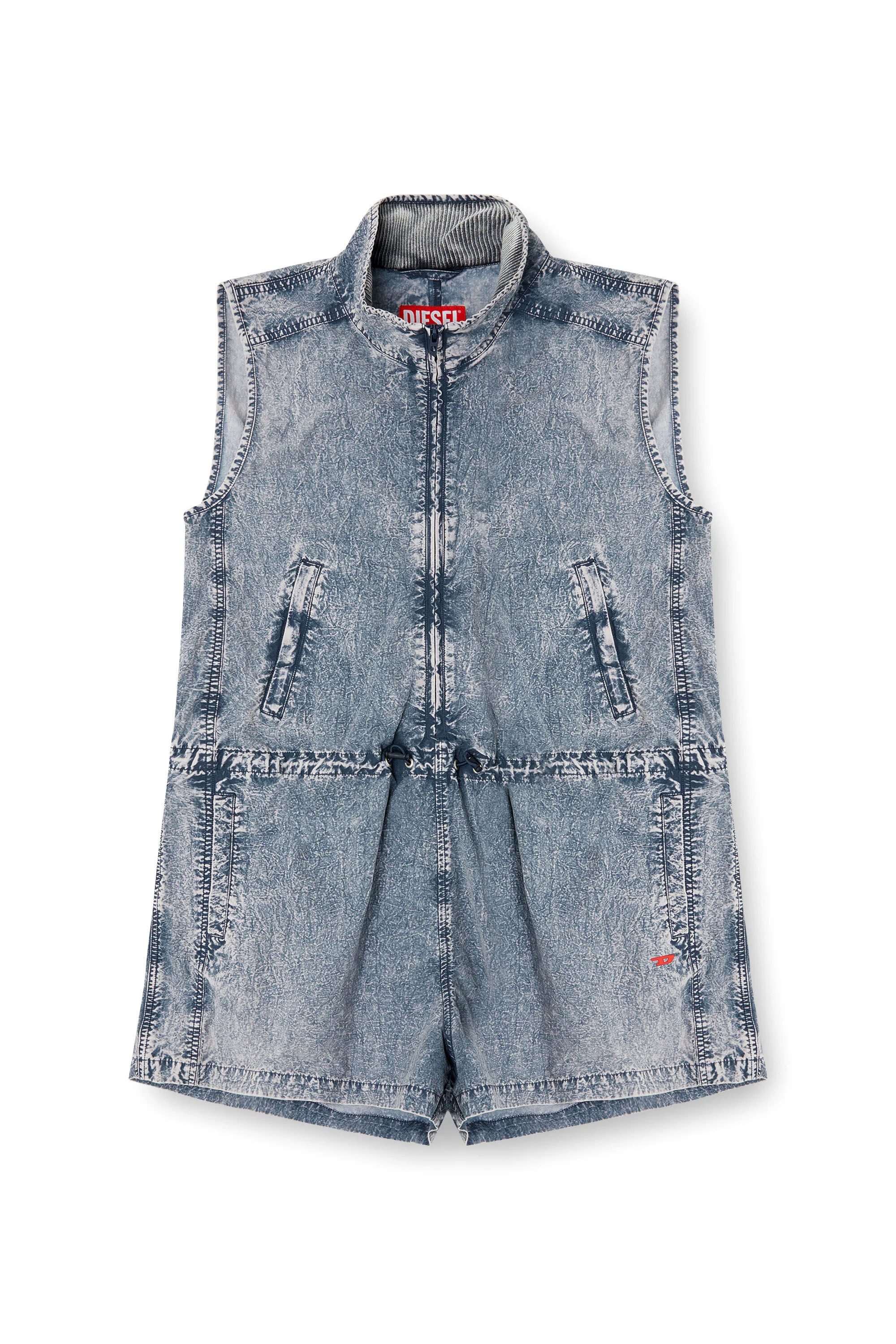 Product Description Women's playsuit in recycled nylon taslan, specially treated to give the effect of denim: the look is washed and lived-in, just like Diesel's iconic 5-pocket styles. Cut in a relaxed fit with a zip, mock collar and elasticated toggle-stopper waist. ID: A193790PLBH Size & Fit Model is wearing an IT size 40 and is 175 cm / 5'7'' Check the size chart to choose the correct size. Materials & Details Composition: 100%Polyamide-Nylon Relaxed fit Zip closureWelt pocketsToggle-drawstring waistUpper, side and back pockets