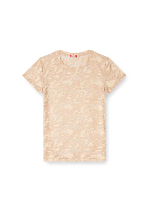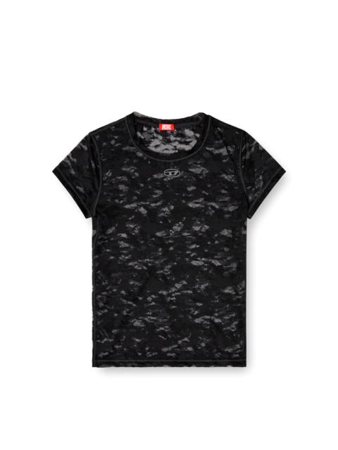 Product Description Women's lingerie top with cap sleeves, crafted from soft stretch lace with a utilitarian camouflage pattern. A tonal Oval D logo adorns the front. ID: A183150DRAK Size & Fit Model is wearing a size S and is 175 cm / 5'7'' Check the size chart to choose the correct size. Materials & Details Composition: 86%Polyamide-Nylon 14%Elastane-Spandex