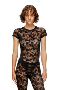 Product Description Women's lingerie top with cap sleeves, crafted from soft stretch lace with a utilitarian camouflage pattern. A tonal Oval D logo adorns the front. ID: A183150DRAK Size & Fit Model is wearing a size S and is 175 cm / 5'7'' Check the size chart to choose the correct size. Materials & Details Composition: 86%Polyamide-Nylon 14%Elastane-Spandex