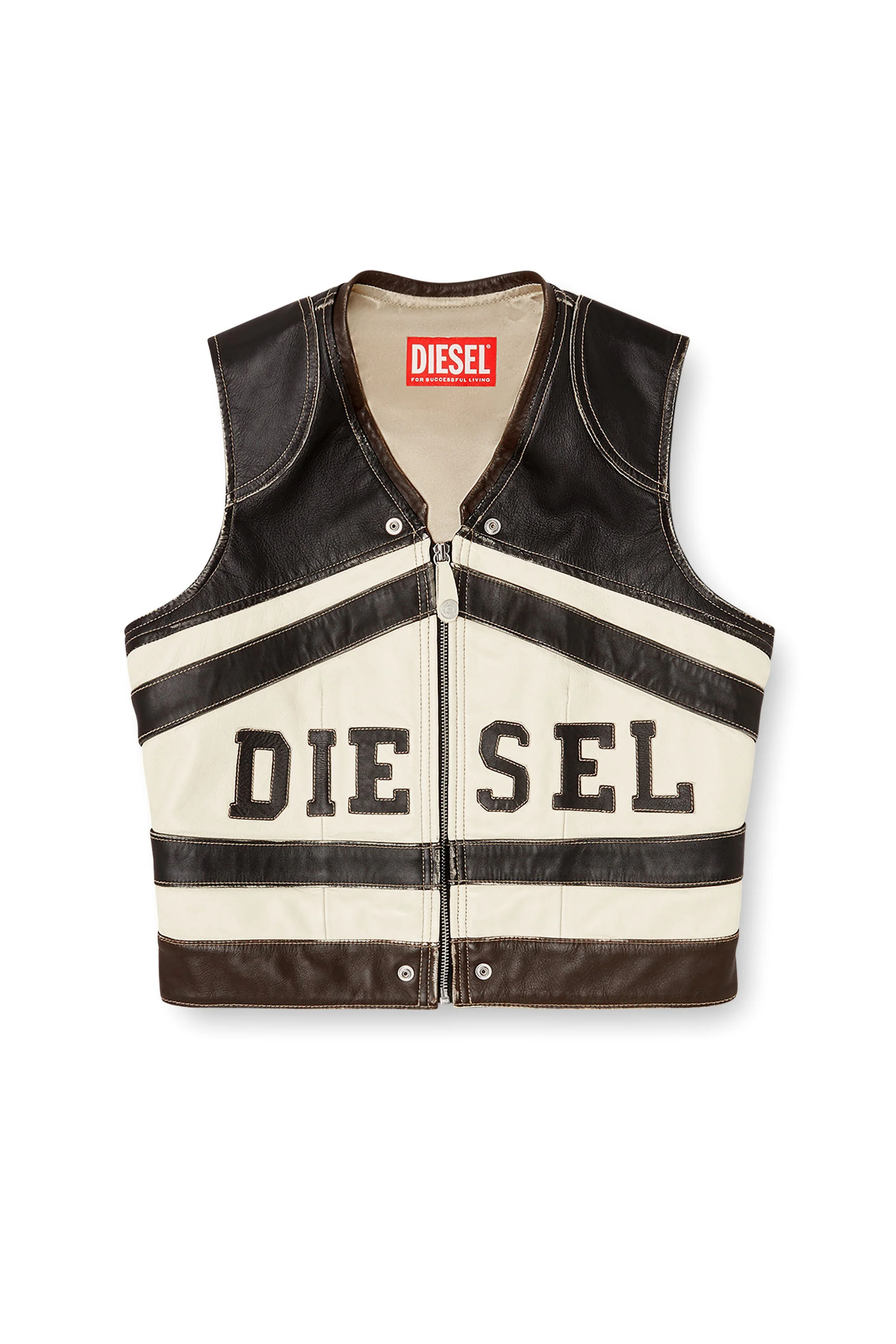 Product Description Leather vest crafted with contrasting panels and bold front Diesel lettering, featuring a zip closure and sleeveless cut. The fabric composition is leather, while graphic bands and visible stitching add visual structure to the design. The back is finished with clean paneling and horizontal stripes for a structured look, enhancing the iconic style and technical character of this female jacket. ID: P016530SPCY Size & Fit Model is wearing an IT size 38 and is 177 cm / 5'9" Materials & Details Composition: 100%Cow Leather Front zip closure Sleeveless Lined