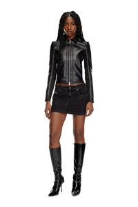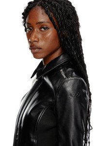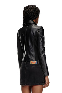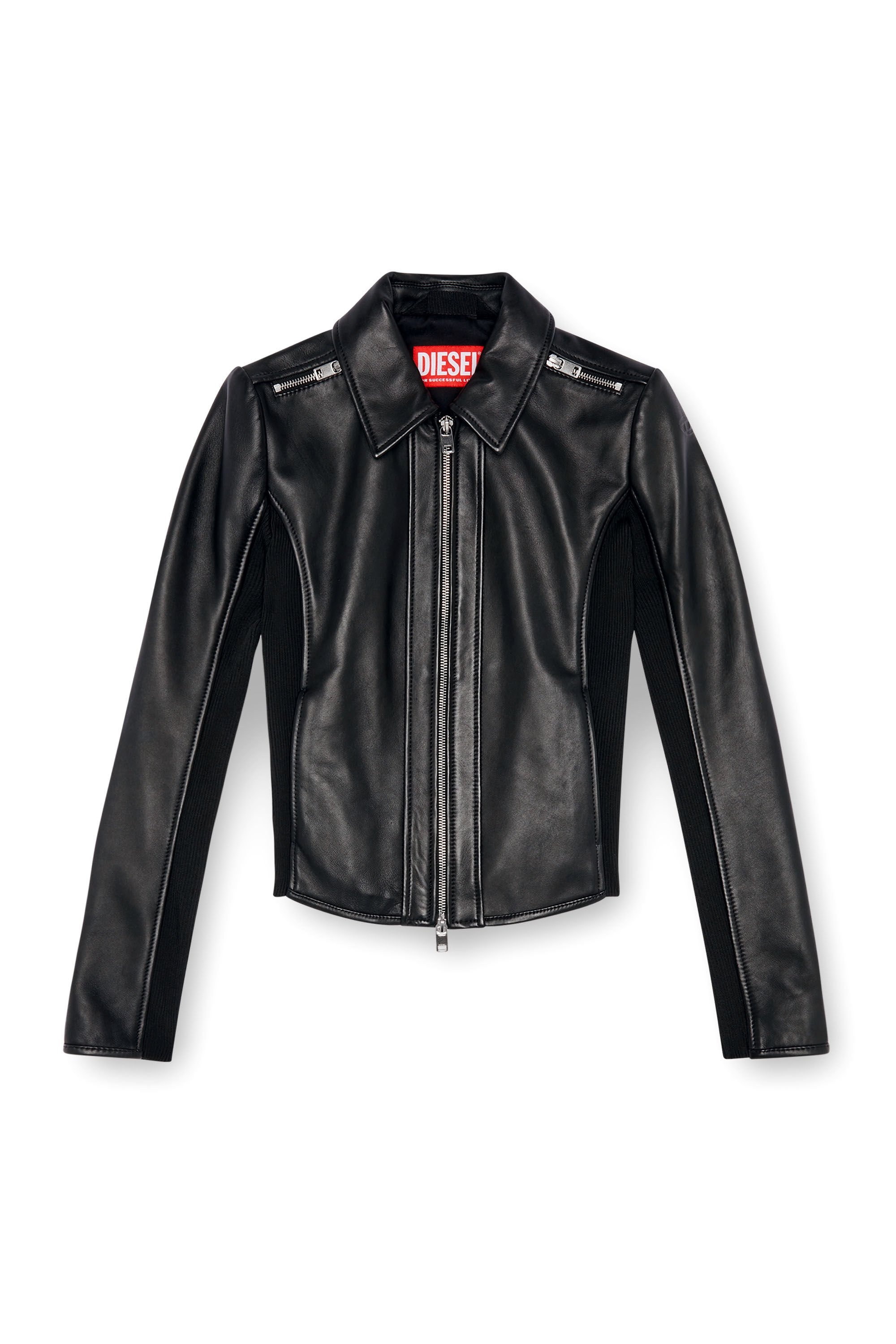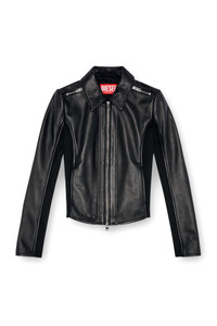 Product Description Made from supple black leather with a sleek finish, this women's biker jacket is designed with a streamlined, slightly cropped silhouette, unlined for extra lightness. Zip detailing draws the eye to the shoulders, while stretchy ribbed panels ensure a flexible fit and nod to a sporty moto aesthetic. Detailed with an embossed oval D logo on the left sleeve. ID: A106700PFAH Size & Fit Model is wearing an IT size 40 and is 175 cm / 5'7'' Check the size chart to choose the correct size. Materials & Details Composition: 100%Sheepskin Leather, Contrast 98%Polyester 2%Elastane-Spandex Slim fit Shirt collar Side pockets Two-way zip closure Unlined