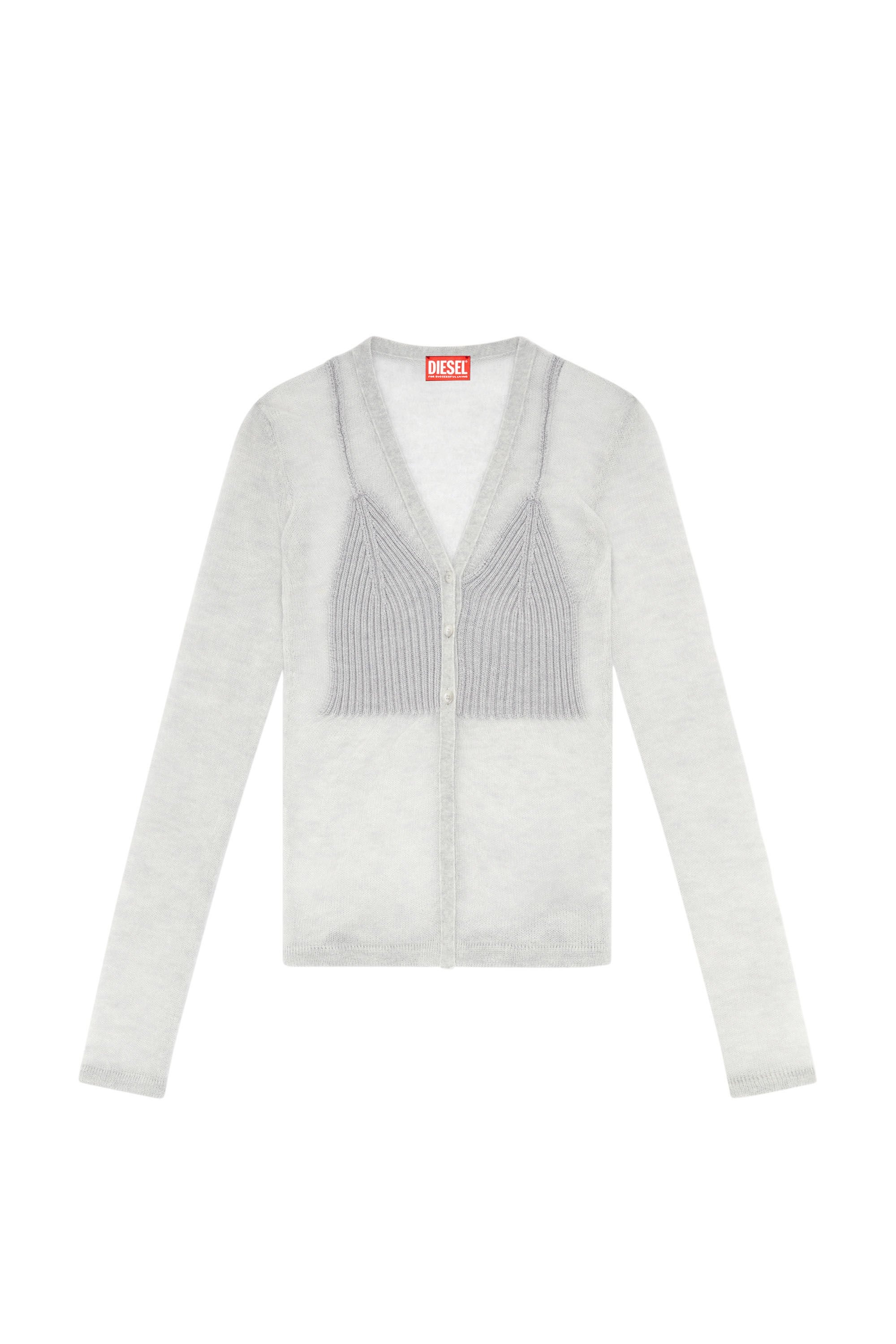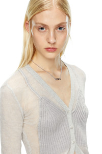 Product Description Spun from a mohair and alpaca blend, this women’s slim cardigan features a delicate sheer construction and three-button closure. The chest is rib-knitted from virgin wool in the shape of a bralette, creating a trompe l'oeil effect and strategic coverage. ID: A143110SKAX Size & Fit Model is wearing a size S and is 175 cm / 5'7'' Check the size chart to choose the correct size. Materials & Details Composition: 35%Mohair 35%Alpaca 30%Polyamide-Nylon, Contrast 100%Virgin Wool Slim fit