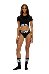 Model is wearing a size S and is 175 cm / 5'7'' Check the size chart to choose the correct size. This women’s crop top is made from breathable stretch cotton with a wide logo-jacquard underband – the oversized branding is purposely ‘cut-off’ for a playful touch.