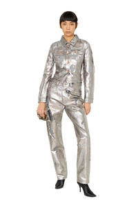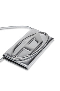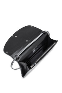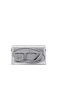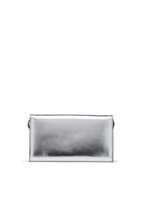 PRODUCT ID: X08824PS202 - 100%Cow Leather - Wallet-on-chain style - Detachable shoulder strap - Snap-fastening flap - Gusseted interior - 4 card slots, note compartment and zipped coin pocket Fitted with a shoulder strap, this versatile women's wallet doubles as a mini bag. The bold metal logo plaque embellishing the flap has a glossy metallic finish that matches the mirrored-leather construction.