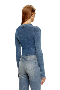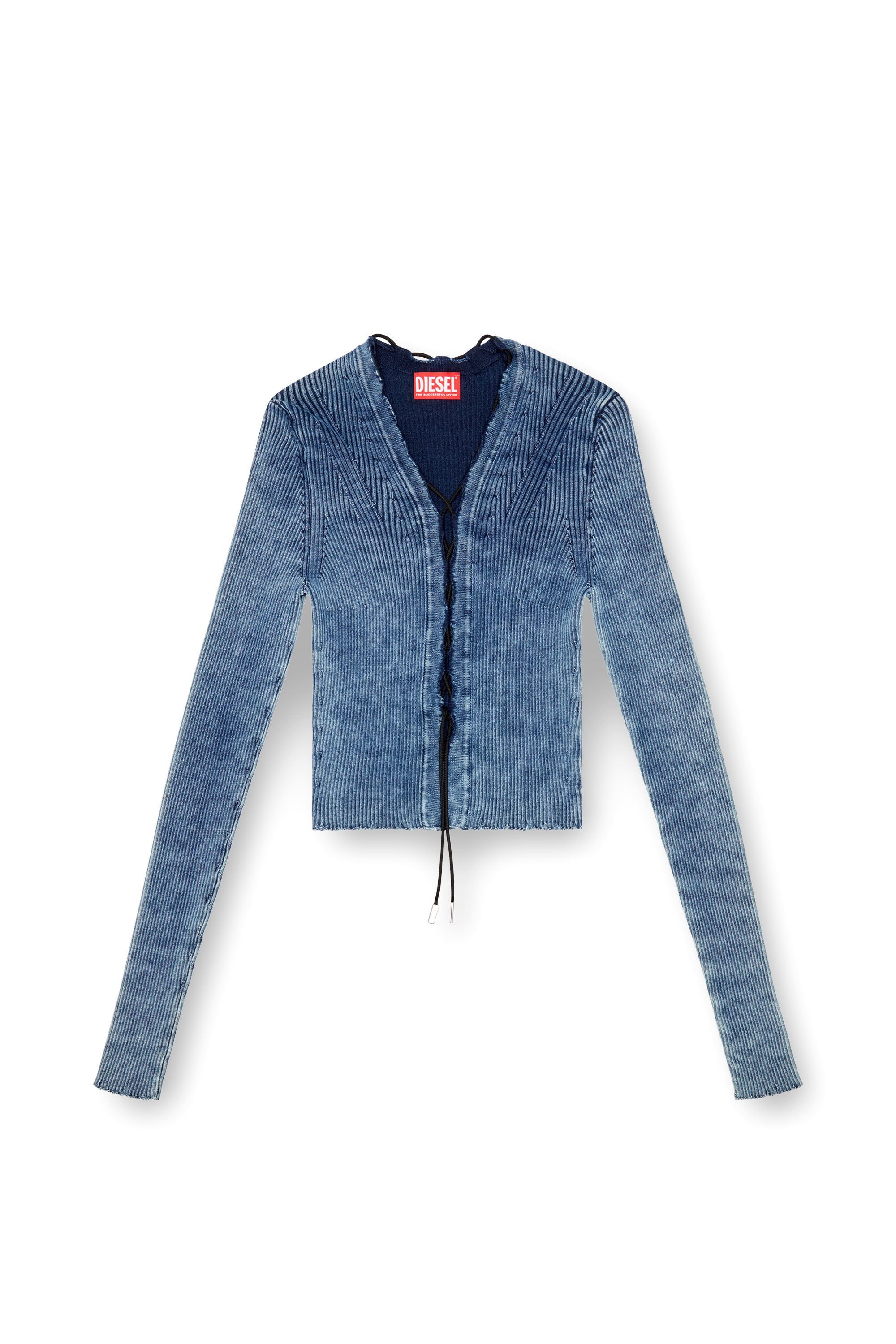 Product Description This women’s ribbed top is a treated indigo knit that resembles denim – Diesel’s DNA fabric. Spun with organic cotton, it has a close fit and a slightly cropped length. Loosen the laced ties to reveal more skin and create a plunging neckline. ID: A142540ANAF Size & Fit Model is wearing a size S and is 175 cm / 5'7'' Check the size chart to choose the correct size. Materials & Details Composition: 100%Cotton Slim fit Adjustable lace-up plunging neckline