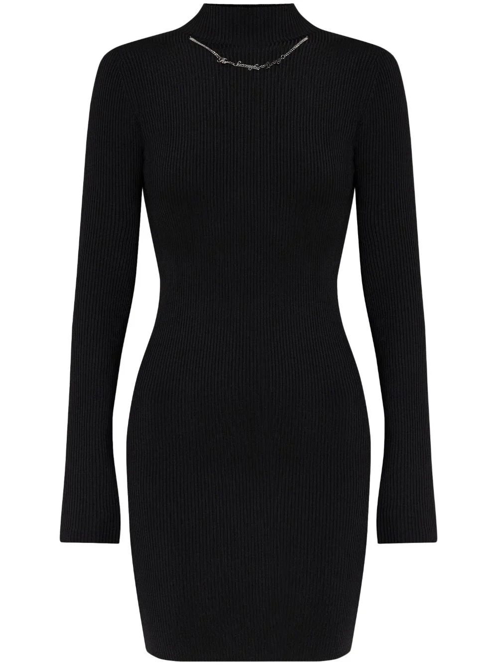 M-Ango-LS dress Highlights - Black - Knitted construction - Silver-tone chain-link necklace detail with slogan text - Mock neck - Long sleeves - Straight hem Imported Composition Viscose 75%, Polyamide 25% Washing instructions Read Manufacturer Guidelines