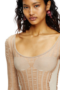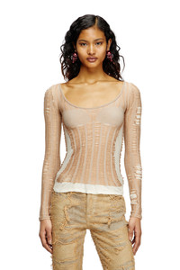 Product Description Part of the SS25 Runway Show edit, this women's seamless knit top is made from a stretchy cotton blend in a nude hue. The result is a second-skin look and fit, just like lingerie: the inspiration behind the jacquard artwork on the bust. Blurring the lines between apparel and underwear, the look is toughened up with distressed laddering effects. ID: A192180BJBI Size & Fit Model is wearing a size S and is 175 cm / 5'7'' Check the size chart to choose the correct size. Materials & Details Composition: 65% COTTON 35% POLYPROPYLENE Spring Summer 2025 Runway Show