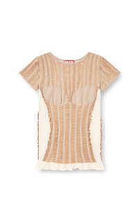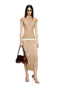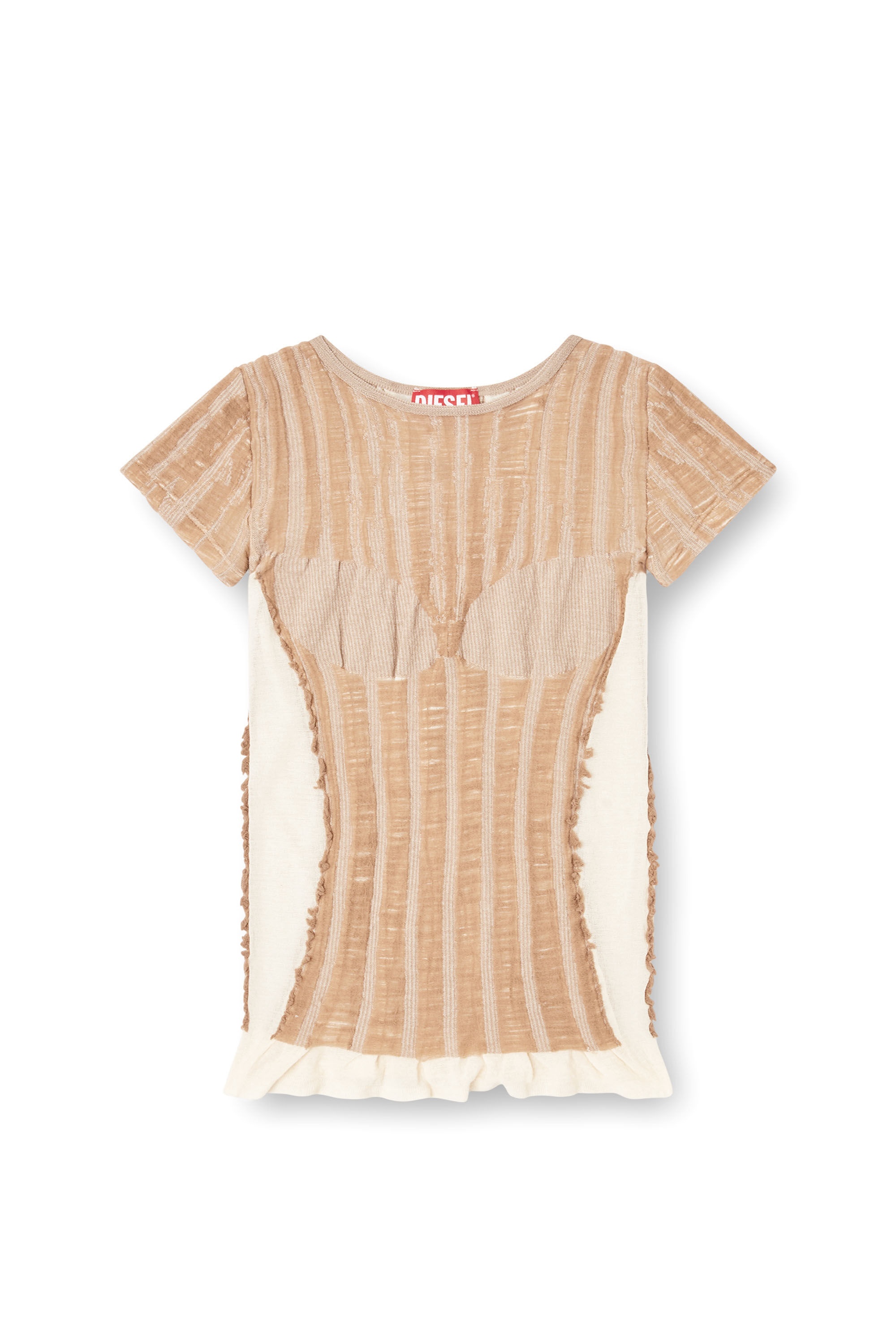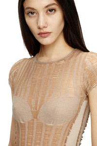 Product Description Fresh from the SS25 Runway Show, this women's seamless T-shirt has been jacquard-knitted with an engineered design that creates the illusion of a bra. Vertical lines magically cinch in the waist, while laddered detailing imbues the design with Diesel's distinctive worn-in look. Spun from nude yarn in a close fit to accentuate its underwear effect. ID: A192190BJBI Size & Fit Model is wearing a size S and is 175 cm / 5'7'' Check the size chart to choose the correct size. Materials & Details Composition: 65% COTTON 35% POLYPROPYLENE Spring Summer 2025 Runway Show